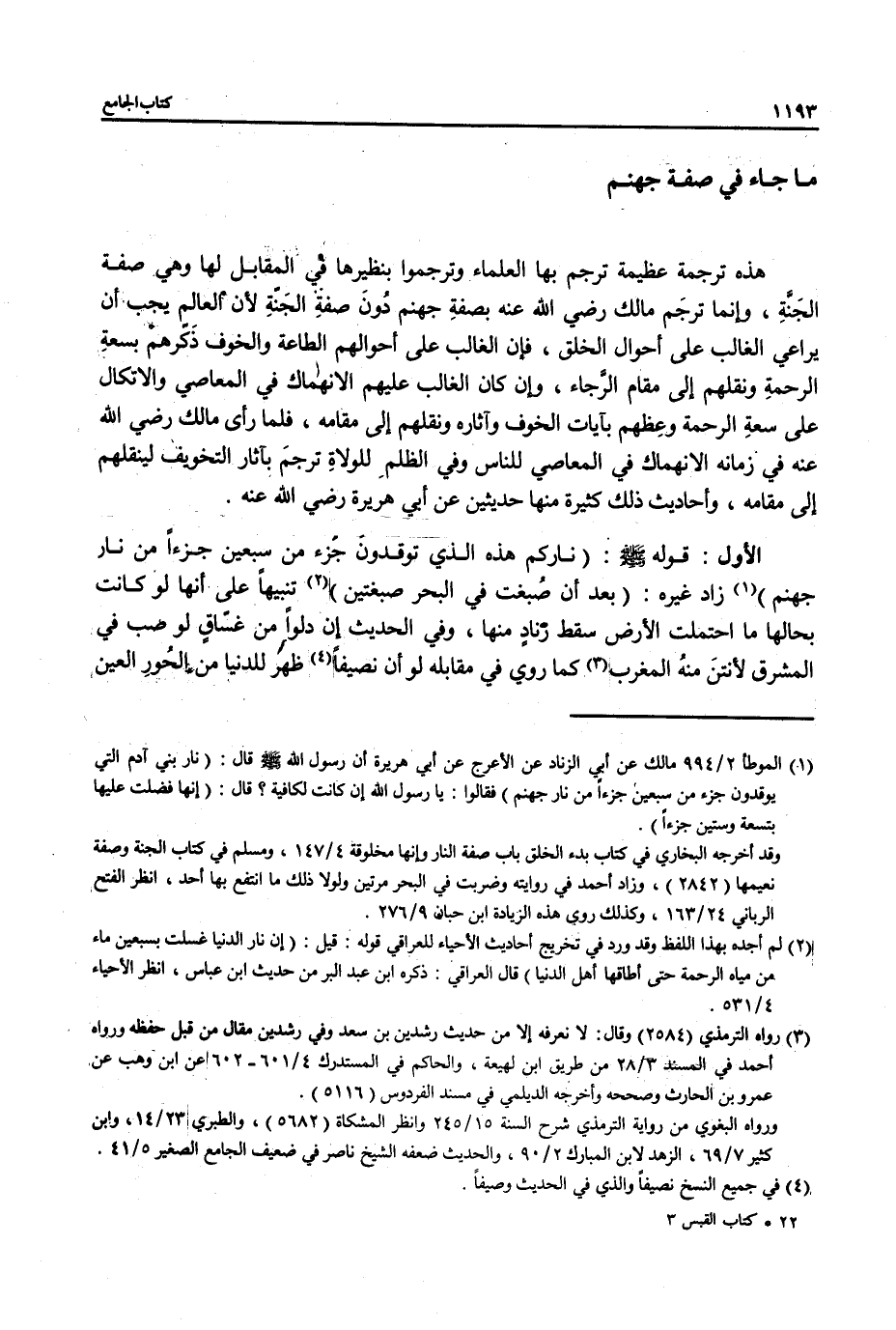 (¬1) الموطأ 2/ 994 مالك عن أبي الزناد عن الأعرج عن أبي هريرة أن رسول الله - صلى الله عليه وسلم - قال: (نار بني آدم التي يوقدون جزء من سبعين جزءاً من نار جهنم) فقالوا: يا رسول الله إن كانت لكافية؟ قال: (إنها فضلت عليها بتسعة وستين جزءاً).