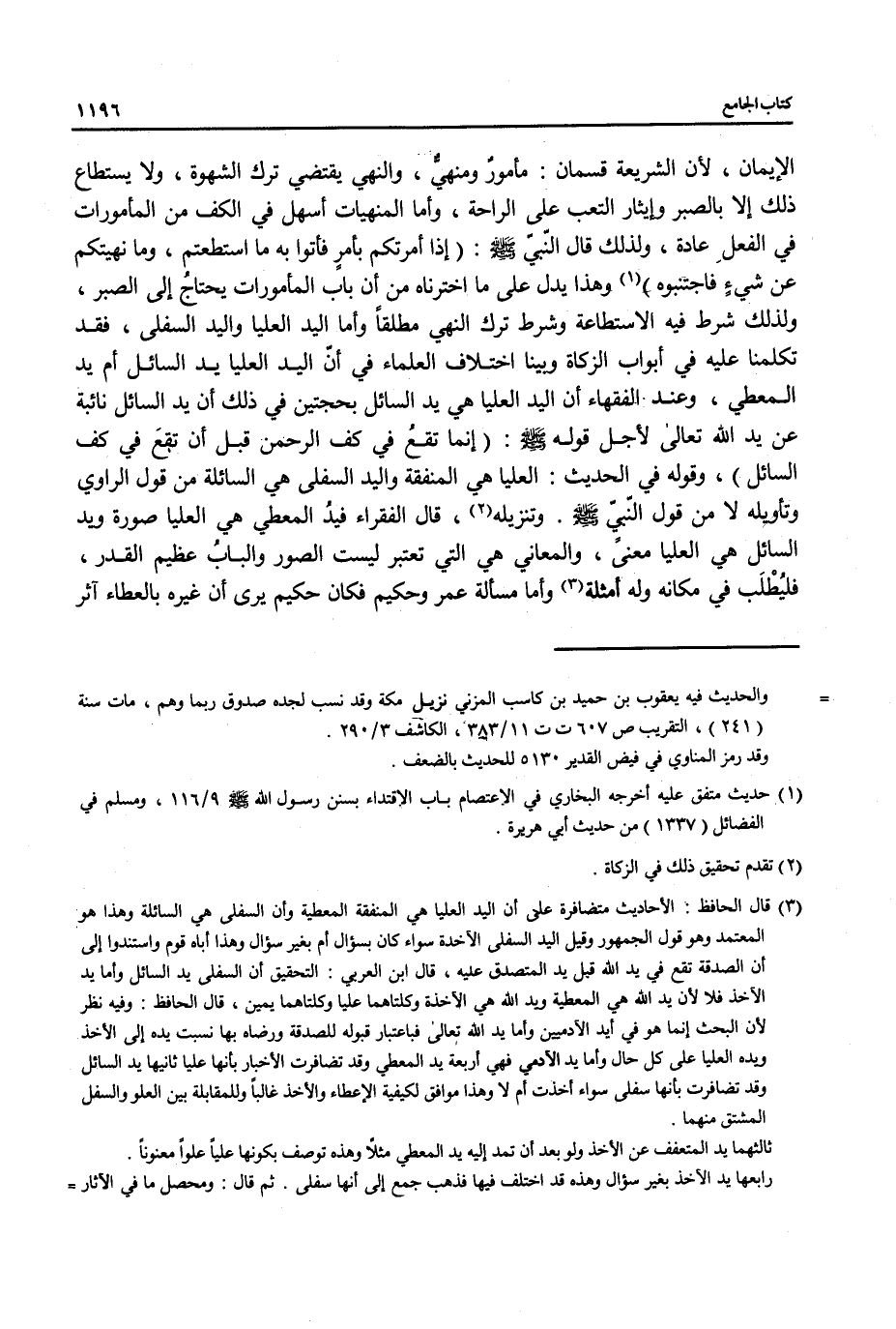 الإيمان, لأن الشريعة قسمان: مأمورٌ ومنهيٌّ، والنهي يقتضي ترك الشهوة، ولا يستطاع ذلك إلا بالصبر وإيثار التعب على الراحة، وأما المنهيات أسهل في الكف من المأمورات في الفعلِ عادة، ولذلك قال النبي - صلى الله عليه وسلم -: (إذا أمرتكم بأمرٍ فأتوا به ما استطعتم، وما نهيتكم عن شيءٍ فاجتنبوه) (¬1) وهذا يدل على ما اخترناه من أن باب المأمورات يحتاجُ إلى الصبر، ولذلك شرط فيه الاستطاعة وشرط ترك النهي مطلقاً وأما اليد العليا واليد السفلى، فقد تكلمنا عليه في أبواب الزكاة وبينا اختلاف العلماء في أن اليد العليا يد السائل أم يد المعطي، وعند الفقهاء أن اليد العليا هي يد السائل بحجتين في ذلك أن يد السائل نائبة عن يد الله تعالى لأجل قوله - صلى الله عليه وسلم -: (إِنما تقعُ في كف الرحمن قبل أن تقعَ في كف السائل)، وقوله في الحديث: العليا هي المنفقة واليد السفلى هي السائلة من قول الراوي وتأويله لا من قول النبي - صلى الله عليه وسلم -. وتنزيله (¬2)، قال الفقراء فيدُ المعطي هي العليا صورة ويد السائل هي العليا معنيً، والمعاني هي التي تعتبر ليست الصور والبابُ عظيم القدر، فليُطْلَب في مكانه وله أمثلة (¬3) وأما مسألة عمر وحكيم فكان حكيم يرى أن غيره بالعطاء آثر