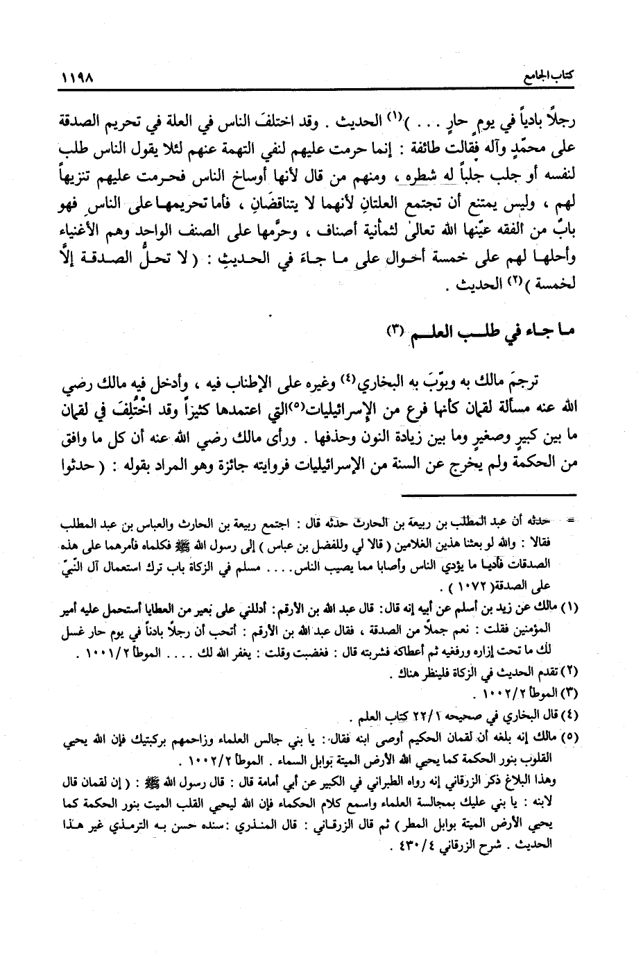 ترجمَ مالك به وبوّبَ به البخاري (¬4) وغيره على الإطناب فيه، وأدخل فيه مالك رضي الله عنه مسألة لقمان كأنها فرع من الإسرائيليات (¬5) التىِ اعتمدها كثيراً وقد اخْتلِفَ في لقمان ما بين كبيرٍ وصغيرٍ وما بين زيادة النون وحذفها. ورأى مالك رضي الله. عنه أن كل ما وافق عن الحكمة ولم يخرج عن السنة من الإسرائيليات فروايته جائزة وهو المراد بقوله: (حدثوا