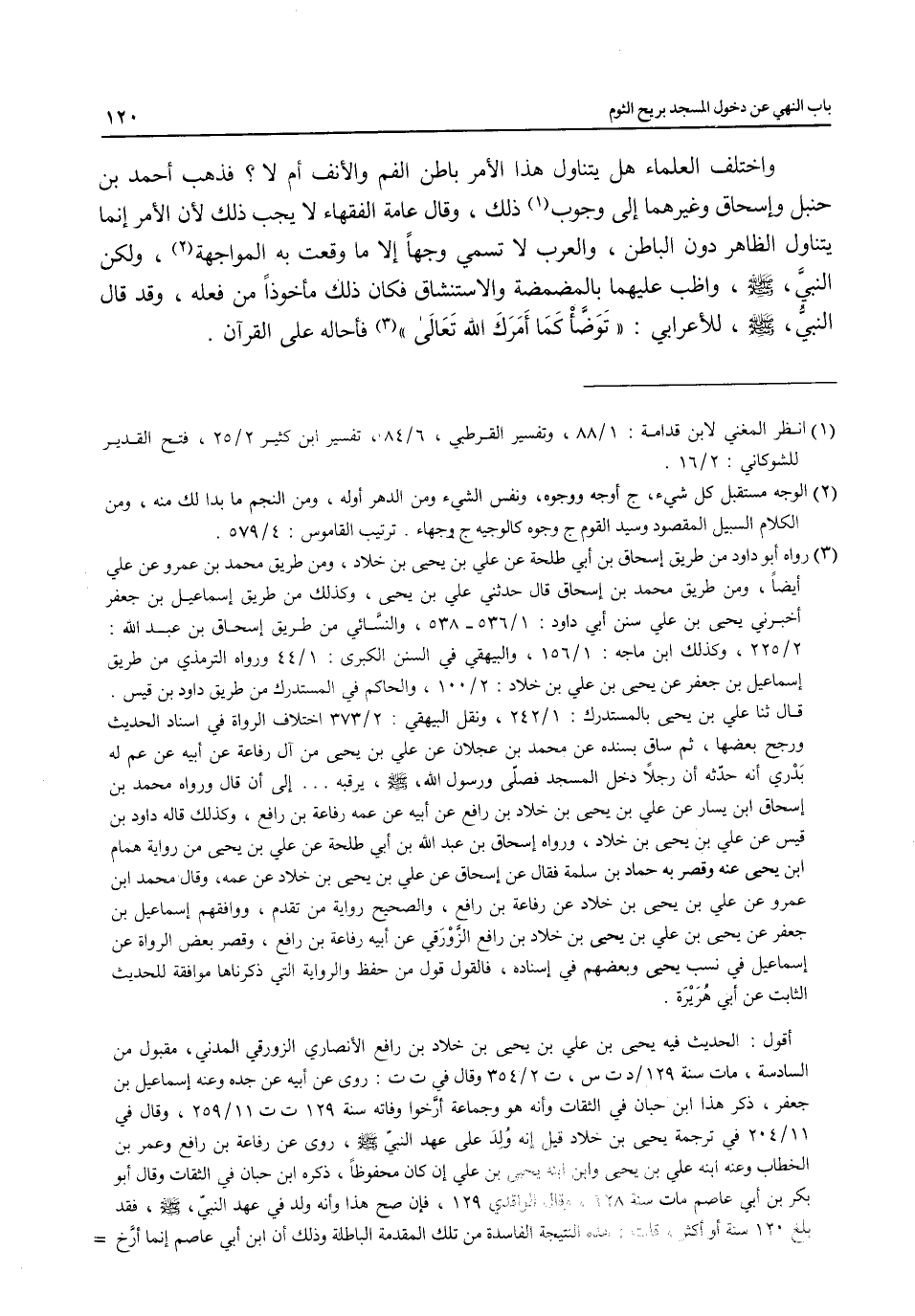 (¬3) رواه أبو داود من طريق إسحاق بن أبي طلحه عن علي بن يحيي بن خلاد، ومن طريق محمَّد بن عمرو عن علي أيضاً، ومن طريق محمَّد بن إسحاق قال حدثني علي بن يحيي، وكذلك من طريق إسماعيل بن جعفر أخبرني يحيي بن علي سنن أبي داود: 1/ 536 - 538، والنسَّائي من طريق إسحاق بن عبد الله: 2/ 225، وكذلك ابن ماجه: 1/ 156، والبيهقي في السنن الكبرى: 1/ 44 ورواه الترمذي من طريق إسماعيل بن جعفر عن يحيي بن علي بن خلاد: 2/ 100، والحاكم في المستدرك من طريق داود بن قيس. قال ثنا علي بن يحيي بالمستدرك: 1/ 242، ونقل البيهقي: 2/ 373 اختلاف الرواة في إسناد الحديث ورجح بعضها، ثم ساق بسنده عن محمَّد بن عجلان عن علي بن يحيي من آل رفاعة عن أبيه عن عم له بَدْري أنه حدّثه أن رجلاً دخل المسجد فصلّى ورسول الله، - صلى الله عليه وسلم -، يرقبه ... إلى أن قال ورواه محمَّد بن إسحاق ابن يسار عن علي بن يحيي بن خلاد بن رافع عن أبيه عن عمه رفاعة بن رافع، وكذلك قاله داود بن قيس عن علي بن يحيي بن خلاد، ورواه إسحاق بن عبد الله بن أبي طلحه عن علي بن يحيي من رواية همام ابن يحيي عنه وقصر به حماد بن سلمة فقال عن إسحاق عن علي بن يحيي بن خلاد عن عمه، وقال محمَّد ابن عمرو عن علي بن يحيي بن خلاد عن رفاعة بن رافع، والصحيح رواية من تقدم، ووافقهم إسماعيل بن جعفر عن يحيي بن علي بن يحيي بن خلاد بن رافع الزَّوْرَقي عن أبيه رفاعة بن رافع، وقصر بعض الرواة عن إسماعيل في نسب يحيي وبعضهم في إسناده، فالقول قول من حفظ والرواية التي فكرناها موافقة للحديث الثابت عن أبي هُرَيْرَة.