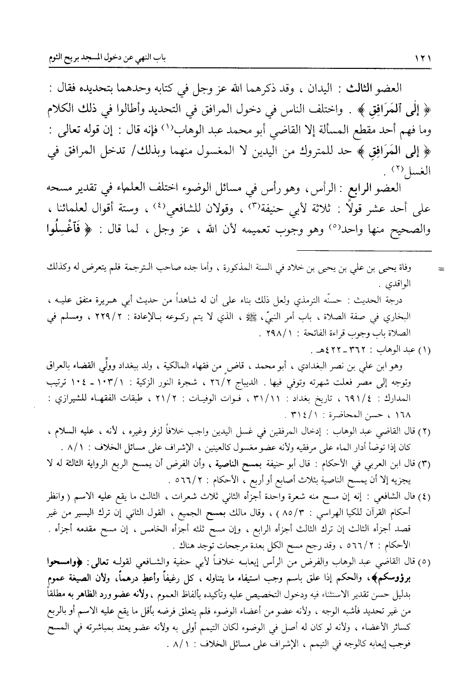 (¬2) قال القاضي عبد الوهاب: إدخال المرفقين في غسل اليدين واجب خلافاً لزفر وغيره, لأنه، عليه السلام، كان إذا توضأ أدار الماء على مرفقيه ولأنه عضو مغسول كالعينين، الإشراف على مسائل الخلاف: 1/ 8.