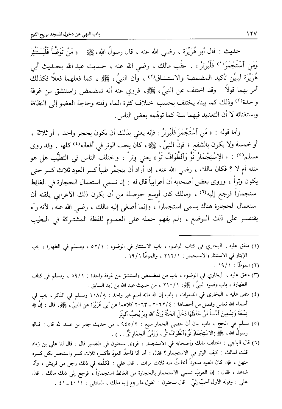 (¬6) قال الباجي: اختلف مالك وأصحابه في الاستجمار، فروى سحنون في التفسير قال: قال لنا علي بن زياد قلت لمالك: كيف الوتر في الاستجمار؛ فقال: أما أنا فآخذ العودَ فاكسره ثلاث كسر واستجمر بكل كسرة منهن، فإن كان العود مدفوناً أخذتُ منه ثلاث مرات. قال علي: فكلمه في ذلك رجل من قريش، وأنا شاهد، فقال: إن العربَ تسمي الاستجمار بالحجارة من الغائط استجماراً، فرجع إلى ذلك مالك. قال علي: وقوله الأول أحبّ إليّ. قال سحنون: القول ما رجع إليه مالك، المنتقى: 1/ 40 - 41.