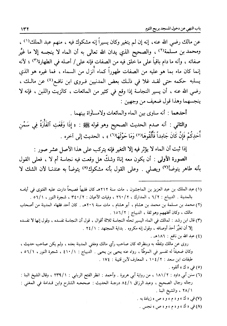 (¬3) قال ابن رشد: لمالك في الماء اليسير تحلُّه النجاسة ثلاثة أقوال، قول أن النجاسة تفسده، وقول إنها لا تفسده إلا أن تغيِّرَ أحدَ أوصافه، وقول إنه مكروه. بداية المجتهد: 1/ 24.
