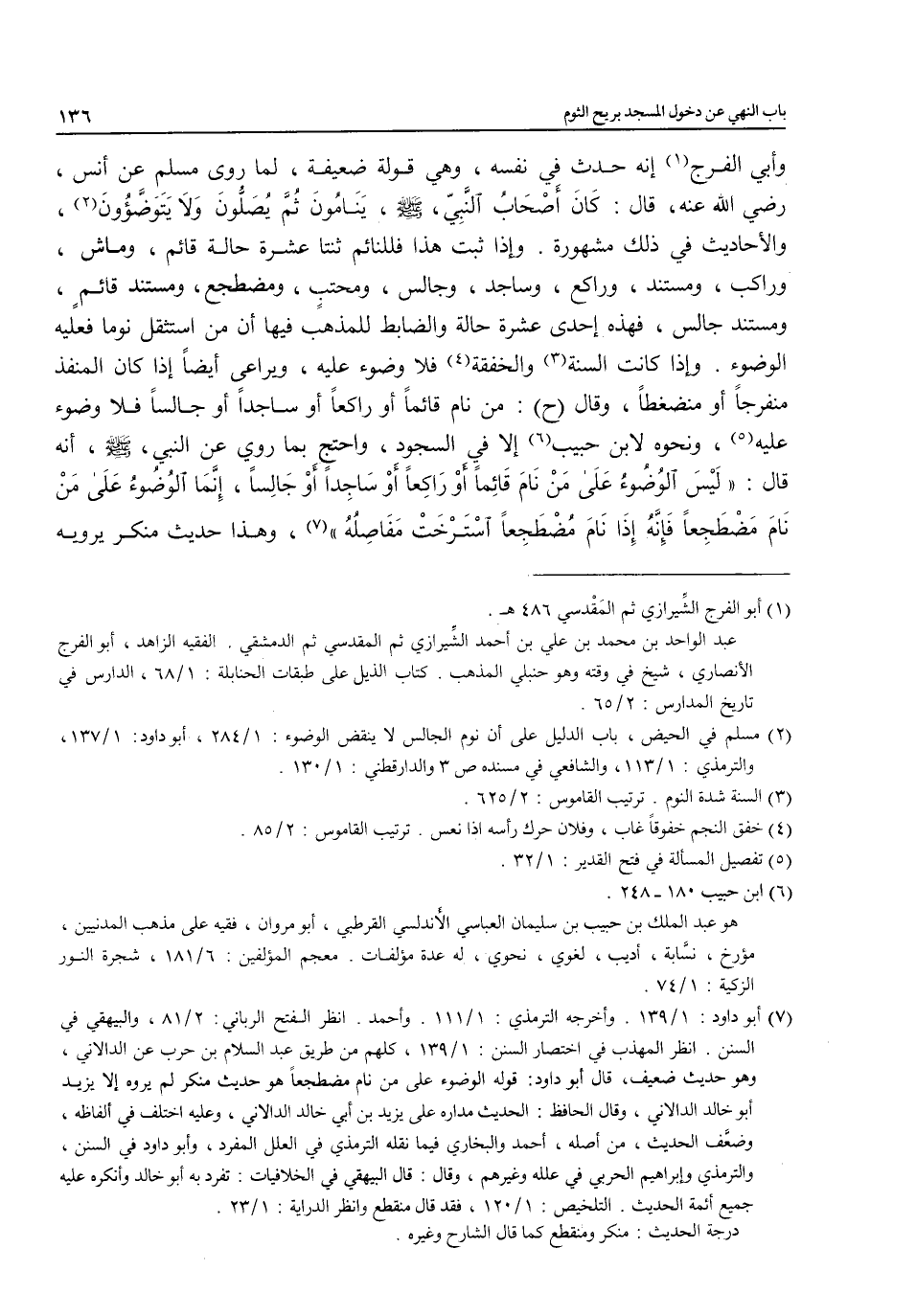 (¬7) أبو داود: 1/ 139. وأخرجه الترمذي: 1/ 111. وأحمد. انظر الفتح الرباني: 2/ 81، والبيهقي في السنن. انظر المهذب في اختصار السنن: 1/ 139، كلهم من طريق عبد السلام بن حرب عن الدالاتي، وهو حديث ضعيف، قال أبو داود: قوله الوضوء على من نام مضطجعاً هو حديث منكر لم يروه إلا يزيد أبو خالد الدالاني، وقال الحافظ: الحديث مداره على يزيد بن أبي خالد الدالاني، وعليه اختلف في ألفاظه، وضعَّف الحديث، من أصله، أحمد والبخاري فيما نقله الترمذي في العلل المفرد، وأبو داود في السنن، والترمذي وإبراهيم الحربي في علله وغيرهم، وقال: قال البيهقي في الخلافيات. تفرد به أبو خالد وأنكره عليه جميع أئمة الحديث. التلخيص: 1/ 120، فقد قال منقطع وانظر الدراية: 1/ 23.