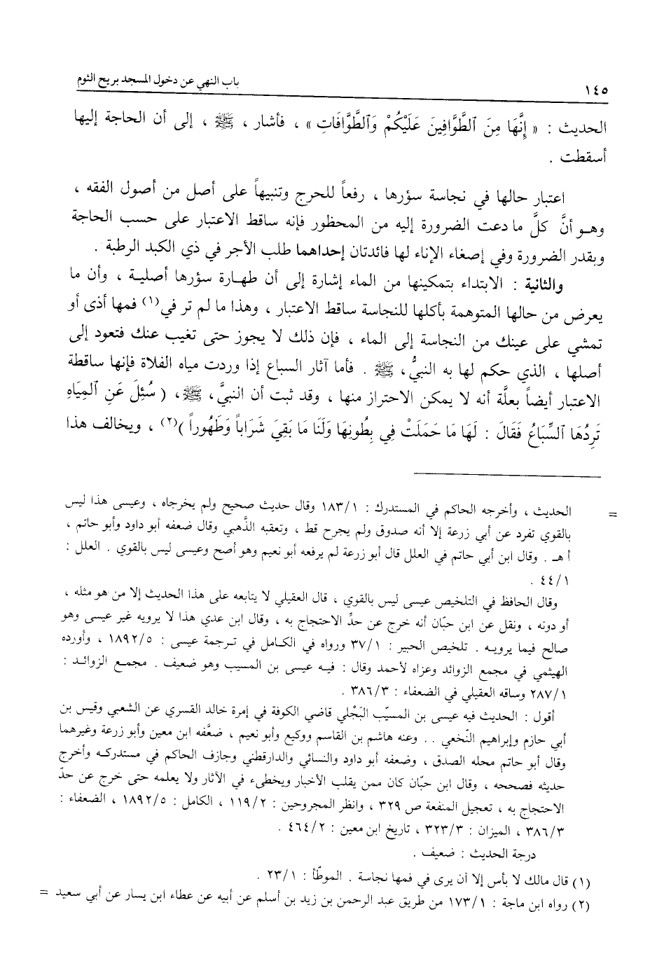 وقال الحافظ في التلخيص عيسى ليس بالقوي، قال العقيلي لا يتابعه على هذا الحديث إلا من هو مثله، أو دونه، ونقل عن ابن حبّان أنه خرج عن حدِّ الاحتجاج به، وقال ابن عدي هذا لا يرويه غير عيسى وهو صالح فيما يرويه. تلخيص الحبير: 1/ 37 ورواه في الكامل في ترجمة عيسى: 5/ 1892، وأورده الهيثمي في مجمع الزوائد وعزاه لأحمد وقال: فيه عيسى بن المسيب وهو ضعيف. مجمع الزوائد: 1/ 287 وساقه العقيلي في الضعفاء: 3/ 386.