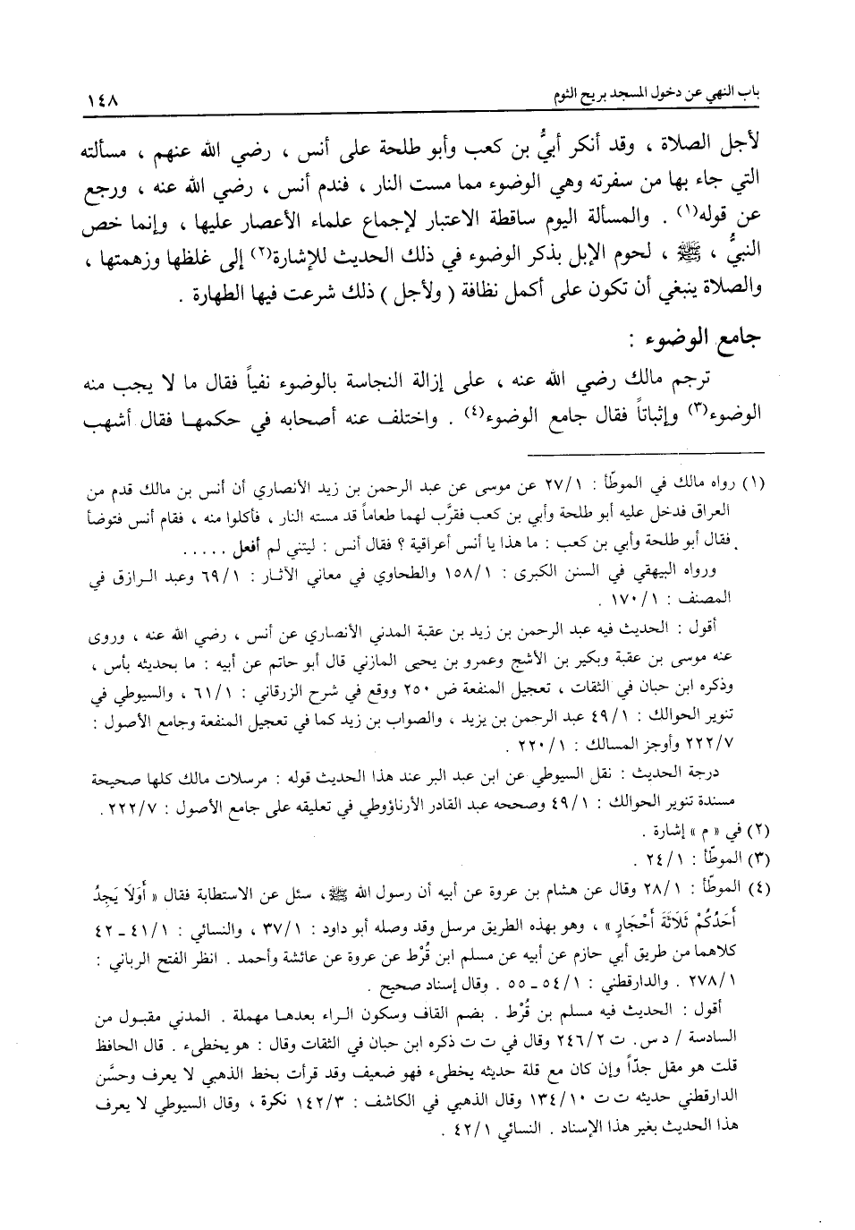 أقول: الحديث فيه عبد الرحمن بن زيد بن عقبة المدني الأنصاري عن أنس، رضي الله عنه، وروى عنه موسى بن عقبة وبكير بن الأشج وعمرو بن يحيى المازني قال أبو حاتم عن أبيه: ما بحديثه بأس، وذكره ابن حبان في الثقات، تعجيل المنفعة ص 250 ووقع في شرح الزرقاني: 1/ 61، والسيوطي في تنوير الحوالك: 1/ 49 عبد الرحمن بن يزيد، والصواب بن زيد كما في تعجيل المنفعة وجامع الأصول: 7/ 222 وأوجز المسالك: 1/ 220.