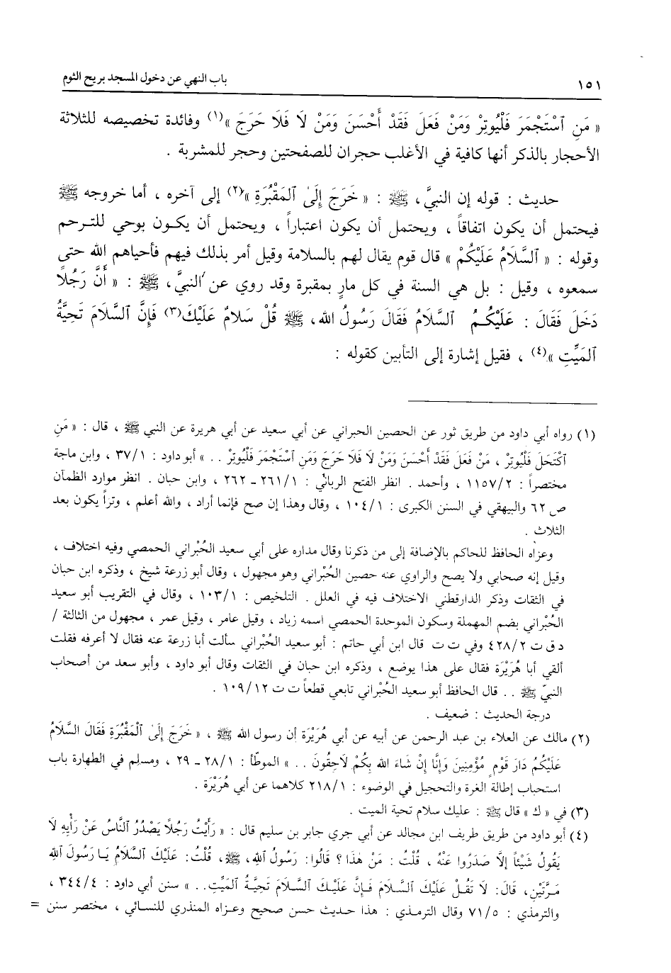 (¬1) رواه أبي داود من طريق ثور عن الحصين الحبراني عن أبي سعيد عن أبي هريرة عن النبي - صلى الله عليه وسلم -، قال: "مَنِ اكْتَحَلَ فَلْيُوتِرْ، مَنْ فَعَلَ فَقَدْ أَحْسَنَ وَمَنْ لَا فَلاَ حَرَجَ وَمَنِ اسْتَجْمَرَ فَلْيُوتِرْ .. " أبو داود 1/ 37، وابن ماجة مختصراً: 2/ 1157، وأحمد. انظر الفتح الرباني: 1/ 261 - 262، وابن حبان. انظر موارد الظمآن ص62 والبيهقي في السنن الكبرى: 1/ 104، وقال وهذا إن صح فإنما أراد، والله أعلم، وتراً يكون بعد الثلاث.