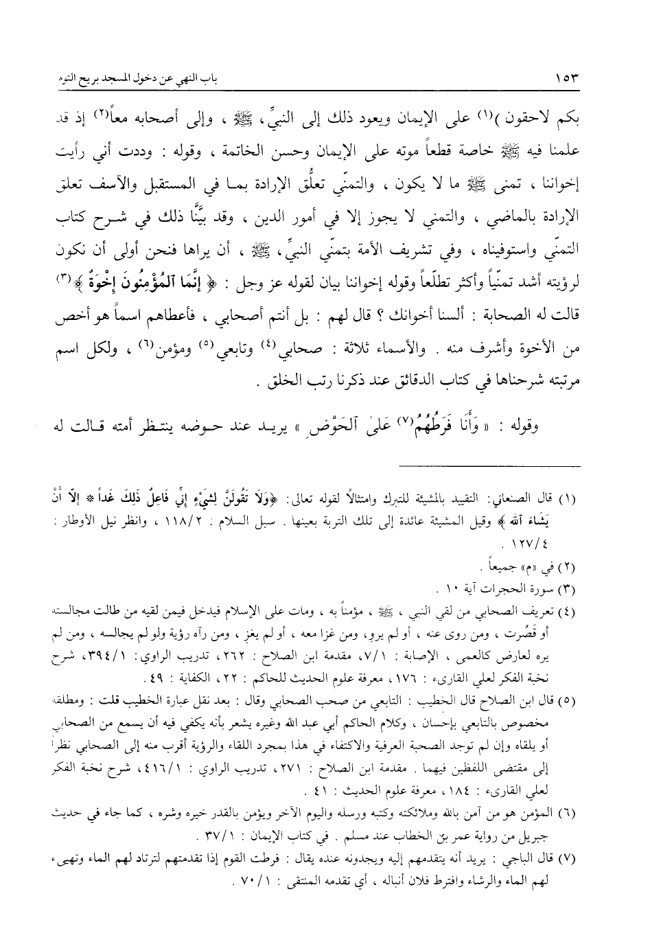 بكم لاحقون) (¬1) على الإيمان ويعود ذلك إلى النبيِّ - صلى الله عليه وسلم -، وإلى أصحابه معاً (¬2) إذ قد علمنا فيه - صلى الله عليه وسلم - خاصة قطعاً موته على الإيمان وحسن الخاتمة، وقوله. وددت أني رأيت إخواننا، تمنى - صلى الله عليه وسلم - ما لا يكون، والتمنّي تعلُّق الإرادة بما في المستقبل والآسف تعلق الإرادة بالماضي، والتمني لا يجوز إلا في أمور الدين، وقد بيَّنَّا ذلك في شرح كتاب التمنّي واستوفيناه، وفي تشريف الأمة بتمنّي النبيِّ, - صلى الله عليه وسلم -، أن يراها فنحن أولى أن نكون لرؤيته أشد تمنّياً وأكثر تطلّعاً وقوله إخواننا بيان لقوله عز وجل: {إِنَّمَا الْمُؤْمِنُونَ إِخْوَةٌ} (¬3) قالت له الصحابة: ألسنا أخوانك؟ قال لهم: بل أنتم أصحابي، فأعطاهم اسماً هو أخص من الأخوة وأشرف منه. والأسماء ثلاثة: صحابي (¬4) وتابعي (¬5) ومؤمن (¬6)، ولكل اسم مرتبته شرحناها في كتاب الدقائق عند ذكرنا رتب الخلق.