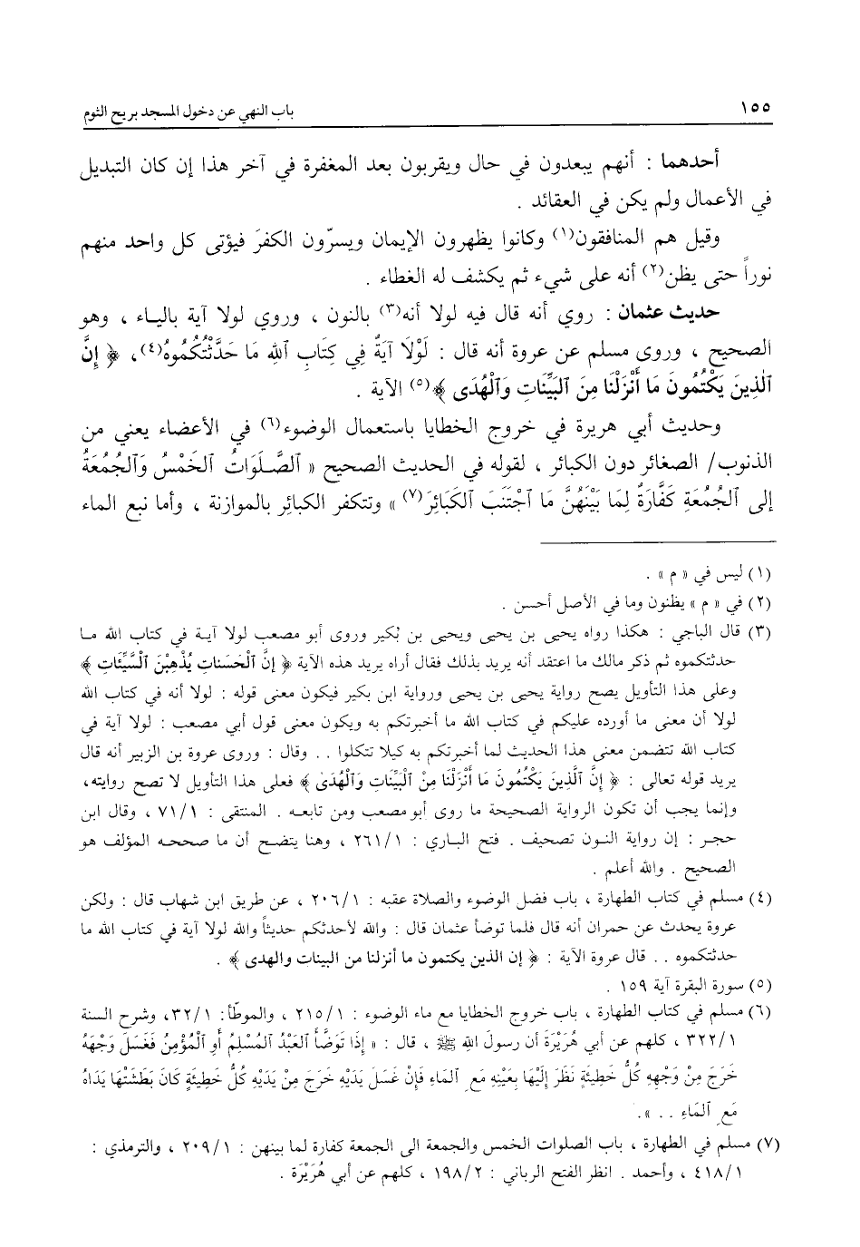 (¬4) مسلم في كتاب الطهارة، باب فضل الوضوء والصلاة عقبه: 1/ 206، عن طريق ابن شهاب قال: ولكن عروة يحدث عن حمران أنه قال فلما توضأ عثمان قال: والله لأحدثكم حديثاً والله لولا آية في كتاب الله ما حدثتكموه .. قال عروة الآية: {إِنَّ الَّذِينَ يَكْتُمُونَ مَا أَنْزَلْنَا مِنَ الْبَيِّنَاتِ وَالْهُدَى}.