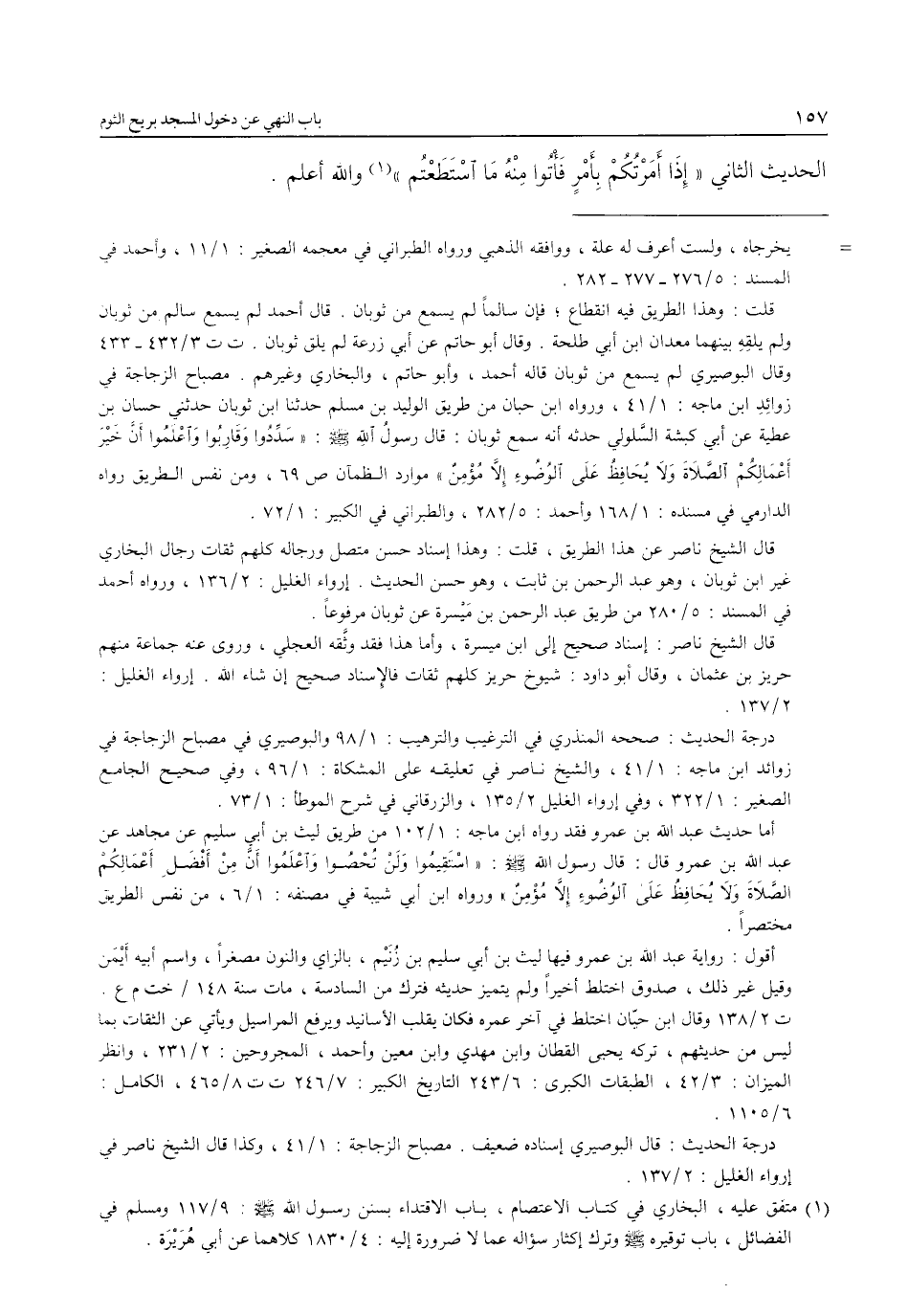 قال الشيخ ناصر عن هذا الطريق، قلت: وهذا إسناد حسن متصل ورجاله كلهم ثقات رجال البخاري غير ابن ثوبان، وهو عبد الرحمن بن ثابت، وهو حسن الحديث. إرواء الغليل 2/ 136، ورواه أحمد في المسند: 5/ 280 من طريق عبد الرحمن بن مَيْسرة عن ثوبان مرفوعاً.