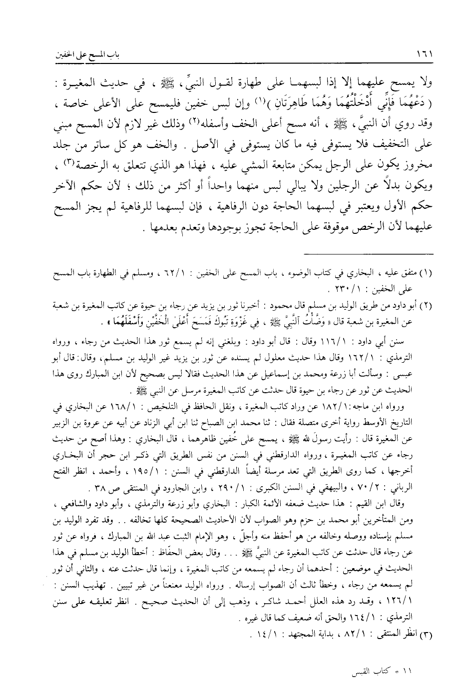 سنن أبي داود: 1/ 116 وقال: قال أبو داود: وبلغني إنه لم يسمع ثور هذا الحديث من رجاء، ورواه الترمذي: 1/ 162 وقال هذا حديث معلول لم يسنده عن ثور بن يزيد غير الوليد بن مسلم، وقال: قال أبو عيسى: وسألت أبا زرعة ومحمد بن إسماعيل عن هذا الحديث فقالا ليس بصحيح لأن ابن المبارك روى هذا الحديث عن ثور عن رجاء بن حيوة قال حدثت عن كاتب المغيرة مرسل عن النبي - صلى الله عليه وسلم -.
