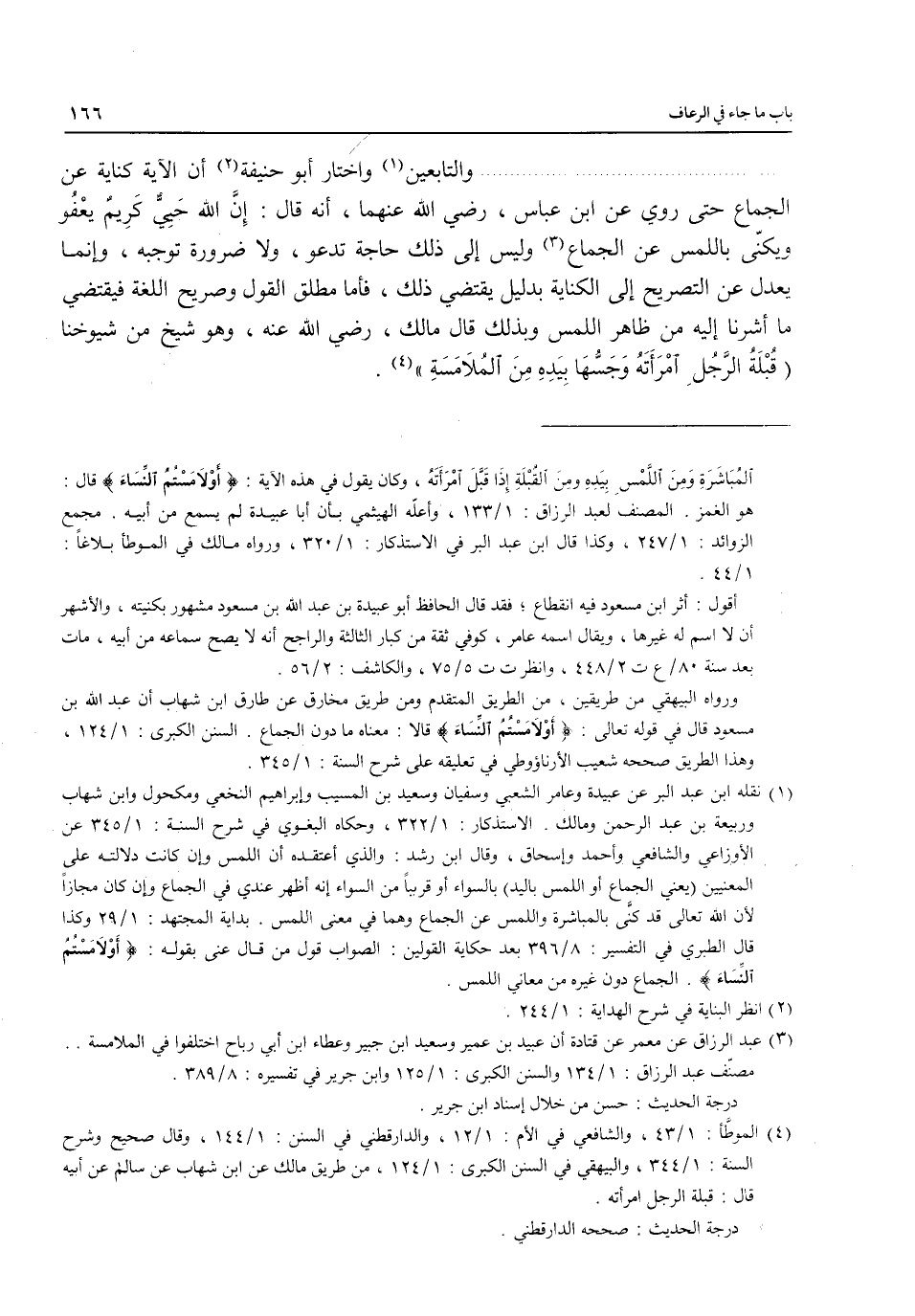 ورواه البيهقي من طريقين، من الطريق المتقدم ومن طريق مخارق عن طارق ابن شهاب أن عبد الله بن مسعود قال في قوله تعالى. {أَوْ لَامَسْتُمُ النِّسَاءَ} قالا: معناه ما دون الجماع. السنن الكبرى: 1/ 124، وهذا الطريق صححه شعيب الأرناؤوطي في تعليقه على شرح السنة: 1/ 345.