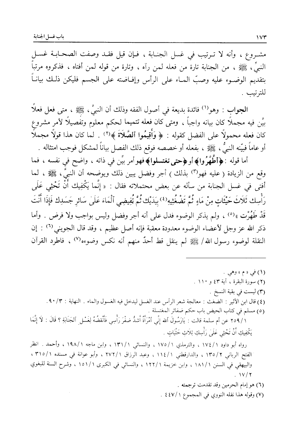 مشروع، وأنه لا ترتيب في غسل الجنابة، فإن قيل فقد وصفت الصحابة غسل النبيِّ، - صلى الله عليه وسلم -، من الجنابة تارة من فعله لمن رآه، وتارة من قوله لمن أفتاه، فذكروه مرتباً بتقديم الوضوء عليه وصبّ الماء على الرأس وإفاضته على الجسم فليكن ذلك بياناً للترتيب.