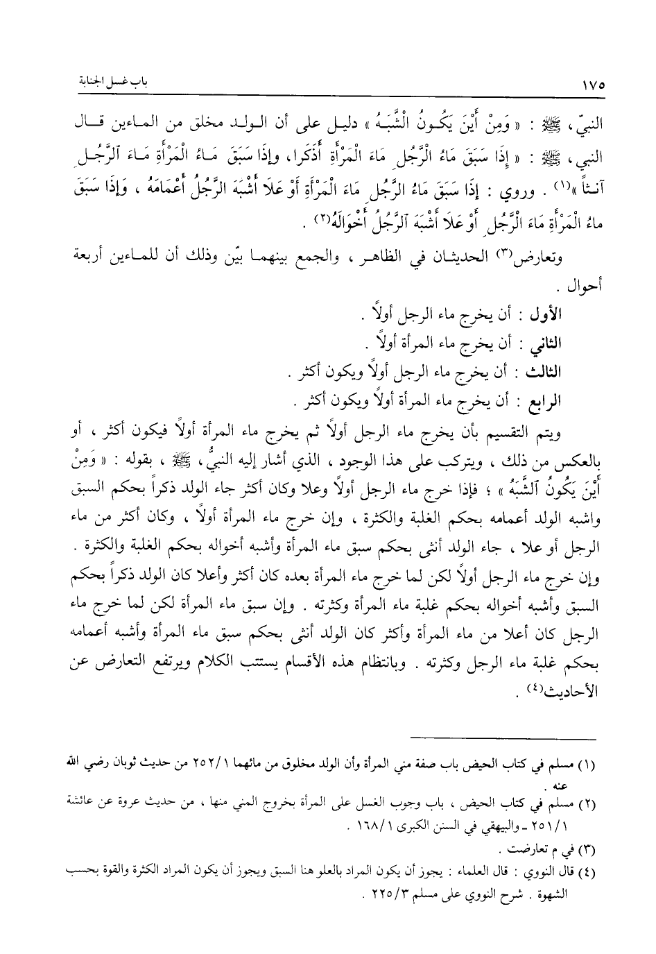 ويتم التقسيم بأن يخرج ماء الرجل أولاً ثم يخرج ماء المرأة أولاً فيكون أكثر، أو بالعكس من ذلك، ويتركب على هذا الوجود، الذي أشار إليه النبيُّ، - صلى الله عليه وسلم -، بقوله: "وَمِنْ أَيْنَ يَكُونُ الشَّبَهُ"؛ فإذا خرج ماء الرجل أولاً وعلا وكان أكثر جاء الولد ذكراً بحكم السبق واشبه الولد أعمامه بحكم الغلبة والكثرة، وان خرج ماء المرأة أولاً، وكان أكثر من ماء الرجل أو علا، جاء الولد أنثى بحكم سبق ماء المرأة وأشبه أخواله بحكم الغلبة والكثرة. وإن خرج ماء الرجل أولاً لكن لما خرج ماء المرأة بعده كان أكثر وأعلا كان الولد ذكراً بحكم السبق وأشبه أخواله بحكم غلبة ماء المرأة وكثرته. وإن سبق ماء المرأة لكن لما خرج ماء الرجل كان أعلى من ماء المرأة وأكثر كان الولد أنثى بحكم سبق ماء المرأة وأشبه أعمامه بحكم غلبة ماء الرجل وكثرته. وبانتظام هذه الأقسام يستتب الكلام ويرتفع التعارض عن الأحاديث (¬4).