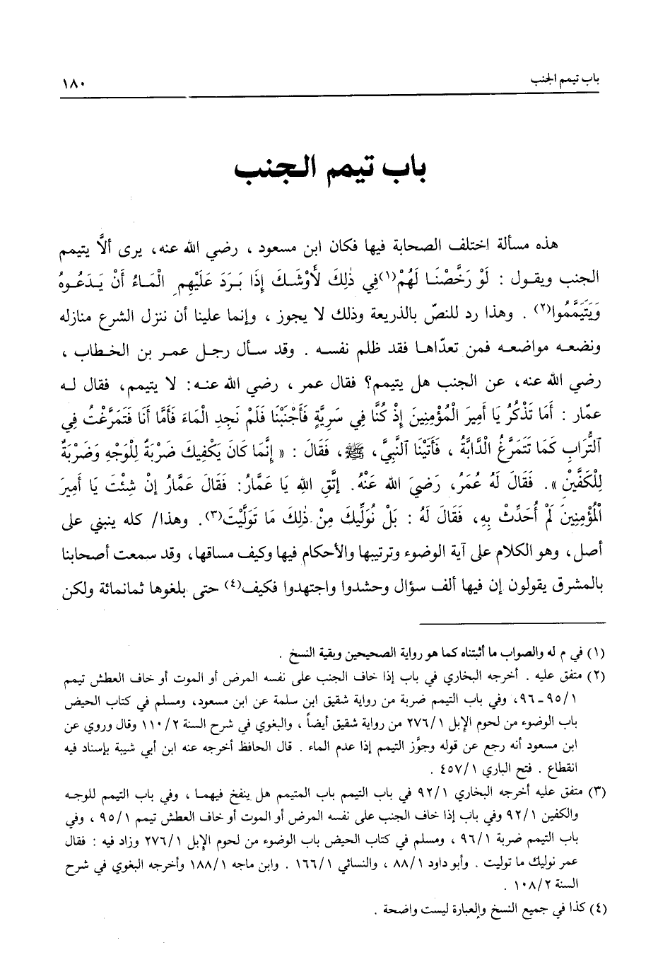 هذه مسألة اختلف الصحابة فيها فكان ابن مسعود، رضي الله عنه، يرى ألاَّ يتيمم الجنب ويقول: لَوْ رَخَّصْنَا لَهُمْ (¬1) فِي ذلِكَ لأوْشَكَ إِذَا بَرَدَ عَلَيْهِمِ الْمَاءُ أَنْ يَدَعُوهُ ويتَيَمَّمُوا (¬2). وهذا رد للنصّ بالذريعة وذلك لا يجوز، وإنما علينا أن ننزل الشرع منازله ونضعه مواضعه فمن تعدّاها فقد ظلم نفسه. وقد سأل رجل عمر بن الخطاب، رضي الله عنه، عن الجنب هل يتيمم؟ فقال عمر، رضي الله عنه: لا يتيمم، فقال له عمّار: أَمَا تَذْكُر يَا أَمِيرَ الْمُؤْمِنِينَ إِذْ كُنَّا في سَرِيَّةٍ فَأَجْنَبْنَا فَلَمْ نَجِدِ الْمَاءَ فَأَمَّا أَنَا فَتَمَرَّغْت في التُّرَابِ كَمَا تَتَمَرَّغ الْدَّابةُ، فَأَتَيْنَا النَّبِيَّ، - صلى الله عليه وسلم -، فَقَالَ: "إِنَّمَا كَانَ يَكْفِيكَ ضَرْبَةٌ لِلْوَجْهِ وَضَرْبَةٌ لِلْكَفَّين". فَقَالَ لَهُ عُمَر، رَضيَ الله عَنْهُ. إتَقِ الله يَا عَمَّارُ: فَقَالَ عَمَّارُ إنْ شِئْتَ يَا أَمِير اْلمُؤْمِنِينَ لَمْ أُحَدِّثْ بِهِ، فَقَالَ لَهُ: بَلْ نوَلِّيكَ مِنْ ذلِكَ مَا تَوَلَّيْتَ (¬3). وهذا كله ينبني على أصل، وهو الكلام على آية الوضوء وترتيبها والأحكام فيها وكيف مساقها، وقد سمعت أصحابنا بالمشرق يقولون إن فيها ألف سؤال وحشدوا واجتهدوا فكيف (¬4) حتى، بلغوها ثمانمائة ولكن