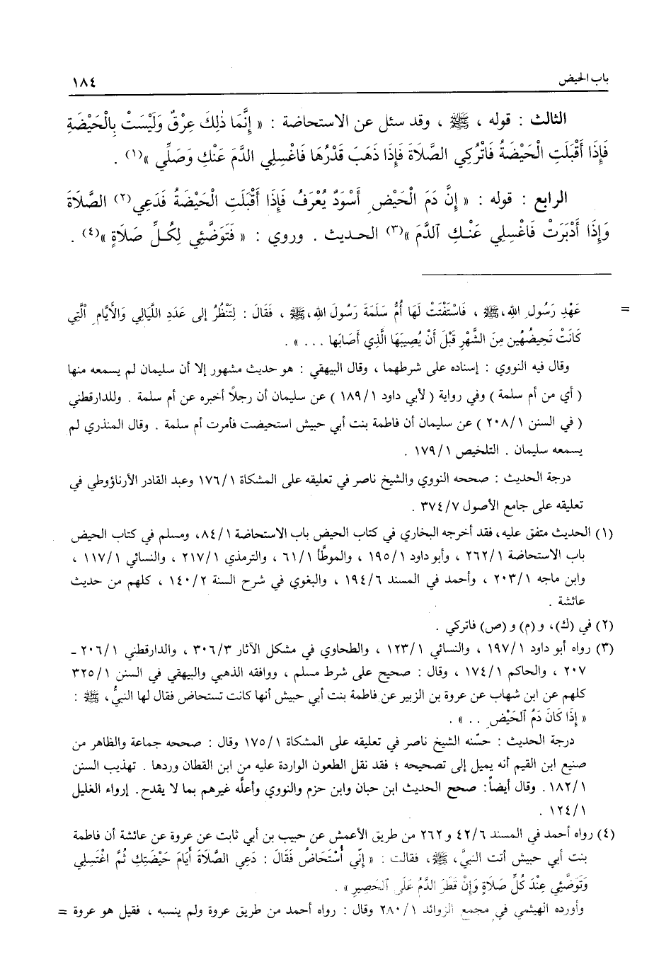 (¬3) رواه أبو داود 1/ 197، والنسائي 1/ 123، والطحاوي في مشكل الآثار 3/ 306، والدارقطني 1/ 206 - 207، والحاكم 1/ 174، وقال: صحيح على شرط مسلم، ووافقه الذهبي والبيهقي في السنن 1/ 325 كلهم عن ابن شهاب عن عروة بن الزبير عن فاطمة بنت أبي حبيش أنها كانت تستحاض فقال لها النبيُّ، - صلى الله عليه وسلم -: "إِذَا كَانَ دَمُ الحَيْضَ .. ".