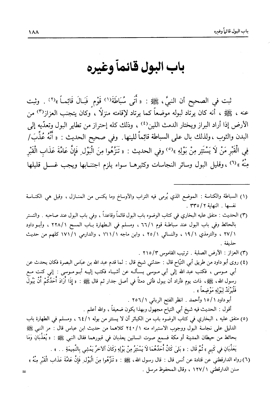 (¬2) الحديث: متفق عليه البخاري في كتاب الوضوء باب البول قائماً وقاعداً، وفي باب البول عند صاحبه. والتستر بالحائط وفي باب البول عند سباطة قوم 1/ 66، ومسلم في الطهارة باب المسح 1/ 228، وأبو داود 1/ 27، والترمذي 1/ 19، والنسائي 1/ 25، وابن ماجه 1/ 111، الدارمي 1/ 171 كلهم من حديث حذيفة.