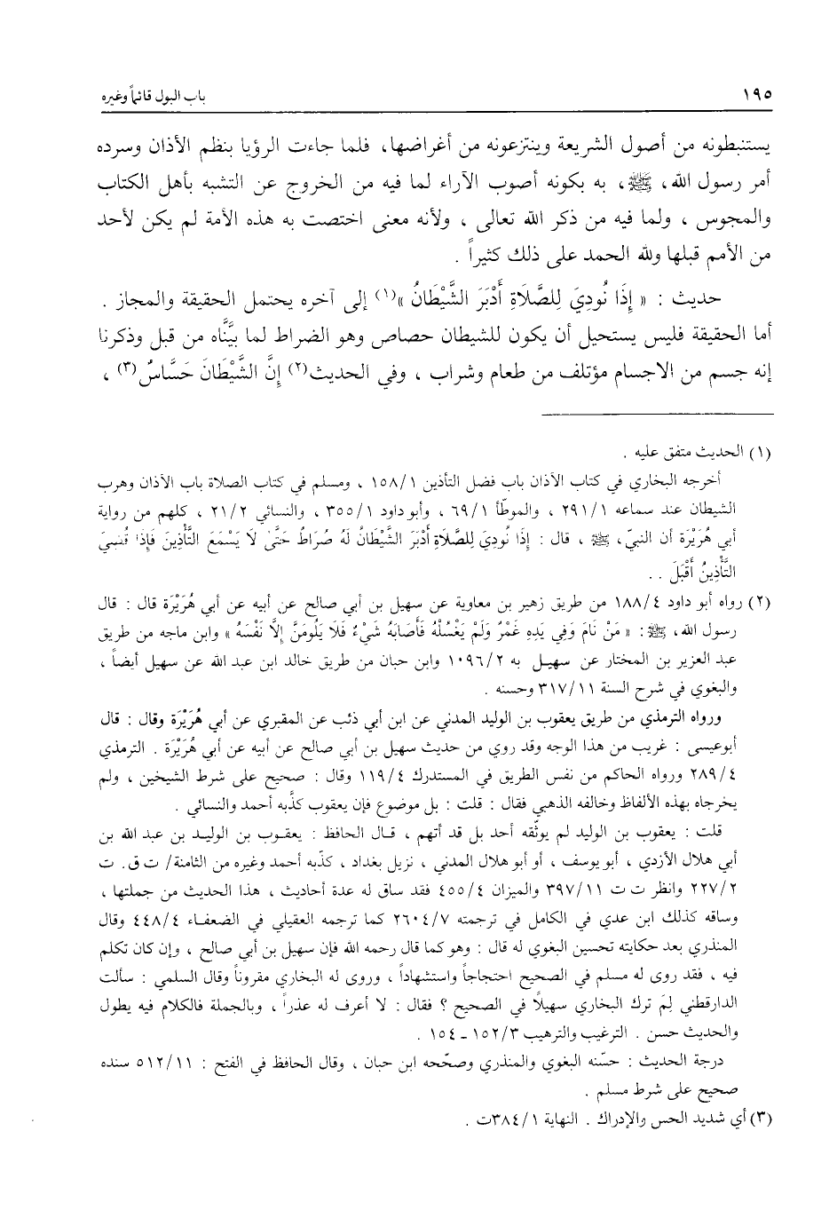حديث: "إِذَا نُوديَ لِلصَّلاَةِ أَدْبَرَ الشَّيْطَان" (¬1) إلى آخره يحتمل الحقيقة والمجاز. أما الحقيقة فليس يستحيل أن يكون للشيطان حصاص وهو الضراط لما بيَّنَّاه من قبل وذكرنا إنه جسم من الأجسام مؤتلف من طعام وشراب، وفي الحديث (¬2) إِنَّ الشَّيْطَانَ حَسَّاسٌ (¬3)،