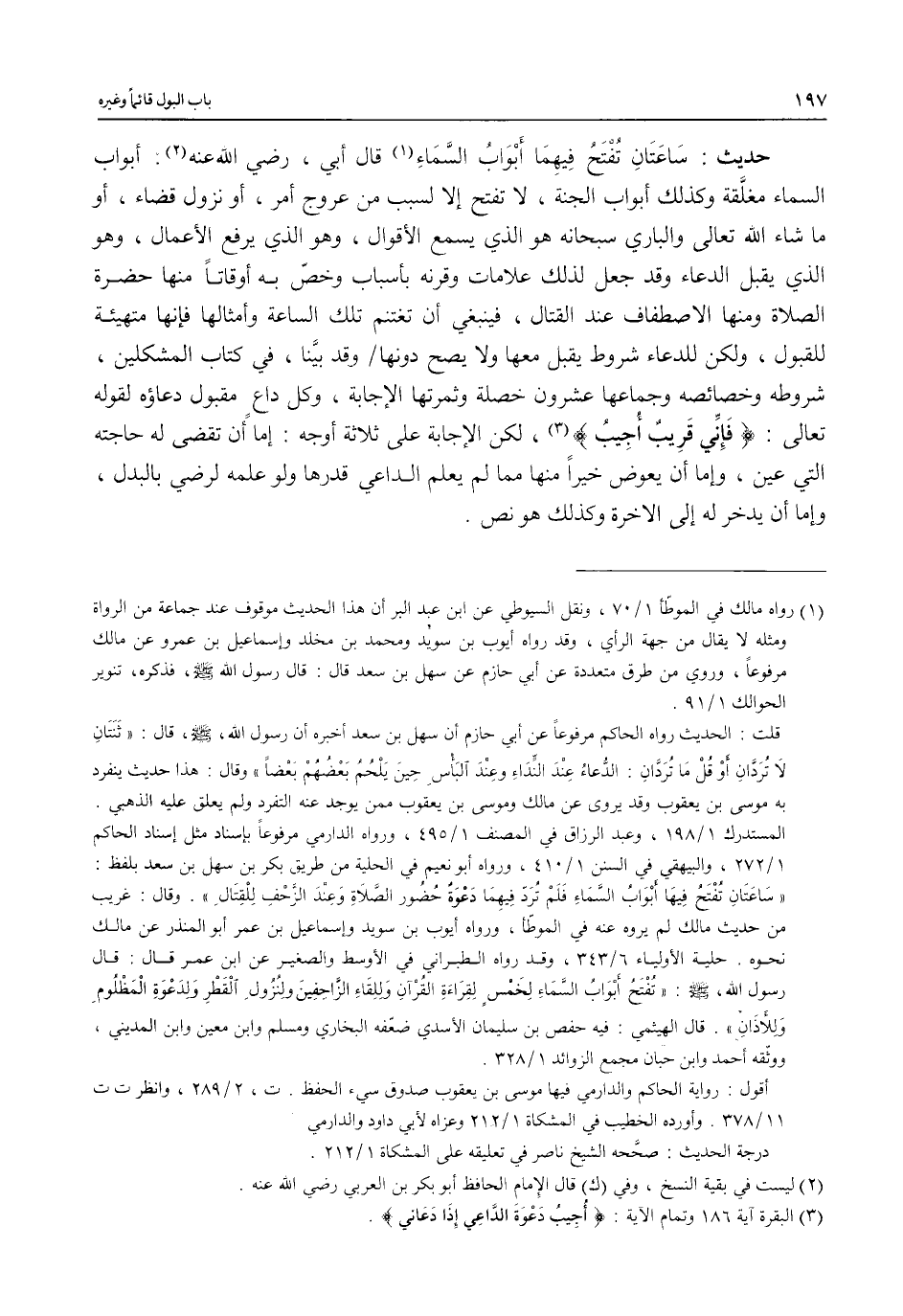 حديث: سَاعَتَانِ تُفتَحُ فِيهِمَا أَبْوَابُ السَّمَاءِ (¬1) قال أبي، رضي الله عنه (¬2). أبواب السماء مغلَّقة وكذلك أبواب الجنة، لا تفتح إلا لسبب من عروج أمر، أو نزول قضاء، أو ما شاء الله تعالى والباري سبحانه هو الذي يسمع الأقوال، وهو الذي يرفع الأعمال، وهو الذي يقبل الدعاء وقد جعل لذلك علامات وقرنه بأسباب وخصّ به أوقاتاً منها حضرة الصلاة ومنها الاصطفاف عند القتال، فينبغي أن تغتنم تلك الساعة وأمثالها فإنها متهيئة للقبول، ولكن للدعاء شروط يقبل معها ولا يصح دونها وقد بيَّنا، في كتاب المشكلين، شروطه وخصائصه وجماعها عشرون خصلة وثمرتها الإجابة، وكل داعٍ مقبول دعاؤه لقوله تعالى: {فَإِنِّي قَرِيبٌ أُجِيبُ} (¬3)، لكن الإجابة على ثلاثة أوجه: إما أن تقضى له حاجته التي عين، وإما أن يعوض خيراً منها مما لم يعلم الداعي قدرها ولو علمه لرضي بالبدل، وإما أن يدخر له إلى الآخرة وكذلك هو نص.