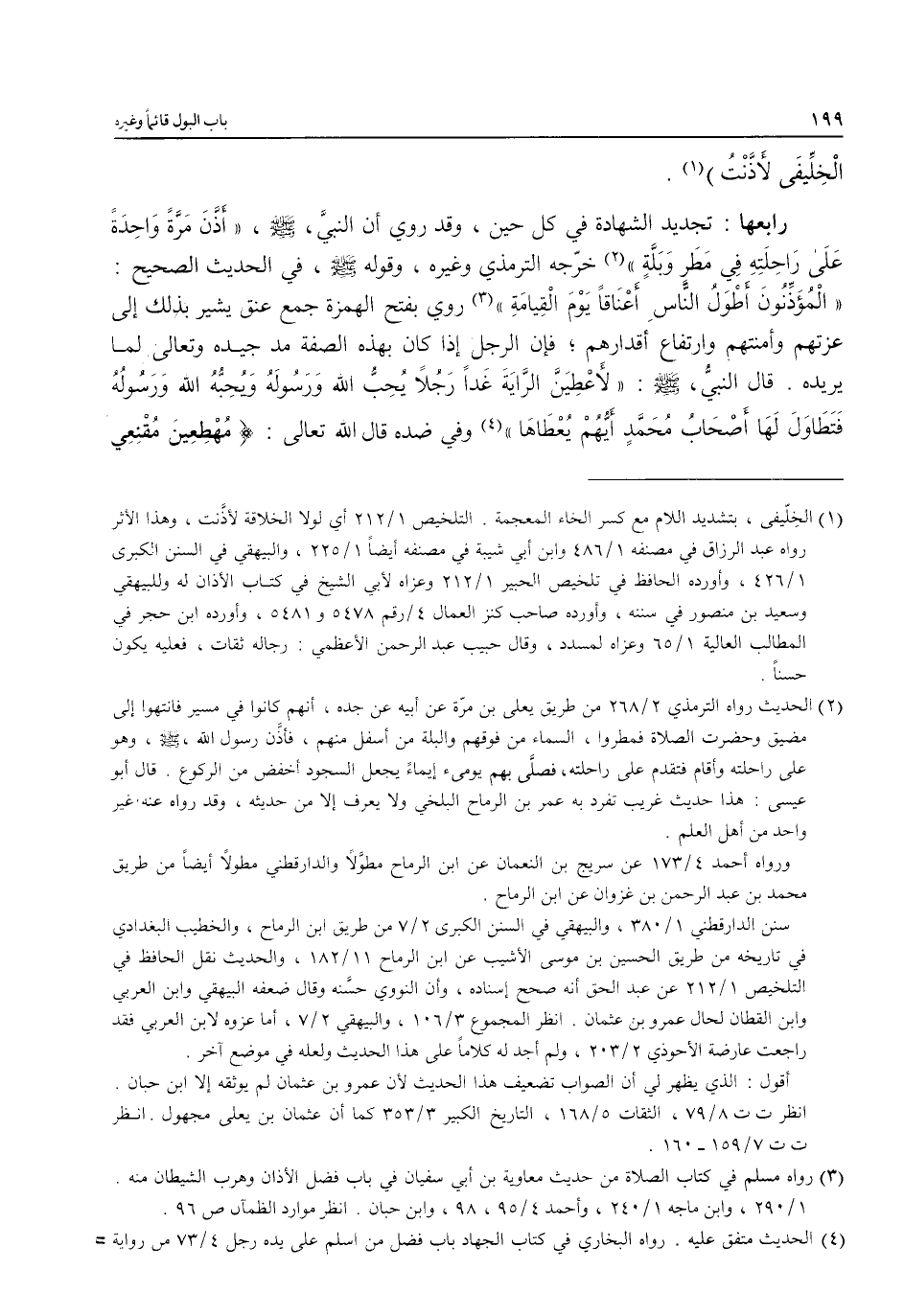 (¬1) الخِلّيفى، بتشديد اللام مع كسر الخاء المعجمة. التلخيص 1/ 212 أي لولا الخلاقة لأذَّنت، وهذا الأثر رواه عبد الرزاق في مصنفه 1/ 486 وابن أبي شيبة في مصنفه أيضاً 1/ 225، والبيهقي في السنن الكبرى 1/ 426، وأورده الحافظ في تلخيص الجبير 1/ 212 وعزاه لأبي الشيخ في كتاب الأذان له وللبيهقي وسعيد بن منصور في سننه، وأورد صاحب كنز العمال 4/ رقم 5478 و 5481، وأورده ابن حجر في المطالب العالية 1/ 65 وعزاه لمسدد، وقال حيب عبد الرحمن الأعظمي: رجاله ثقات، فعليه يكون حسناً.