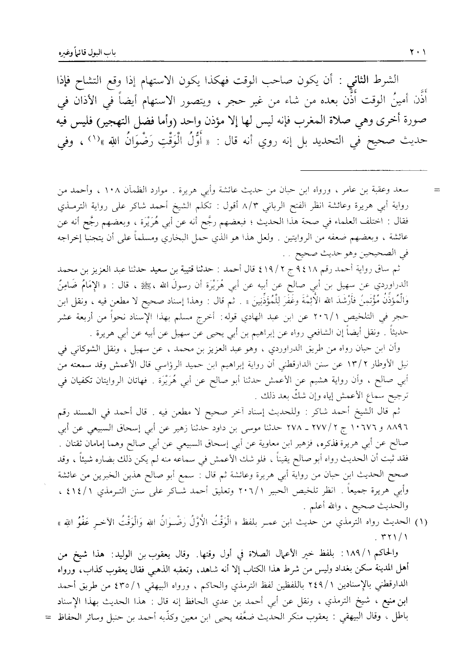 الشرط الثاني: أن يكون صاحب الوقت فهكذا يكون الاستهام إذا وقع التشاح فإذا أذَّن أمينُ الوقت أَذَّن بعده من شاء من غير حجر، ويتصور الاستهام أيضاً في الأذان في صورة أخرى وهي صلاة المغرب فإنه ليس لها إلا مؤذن واحد (وأما فضل التهجير) فليس فيه حديث صحيح في التحديد بل إنه روي أنه قال: "أَوُّلُ الْوَقْتِ رَضْوَانُ الله" (¬1)، وفي