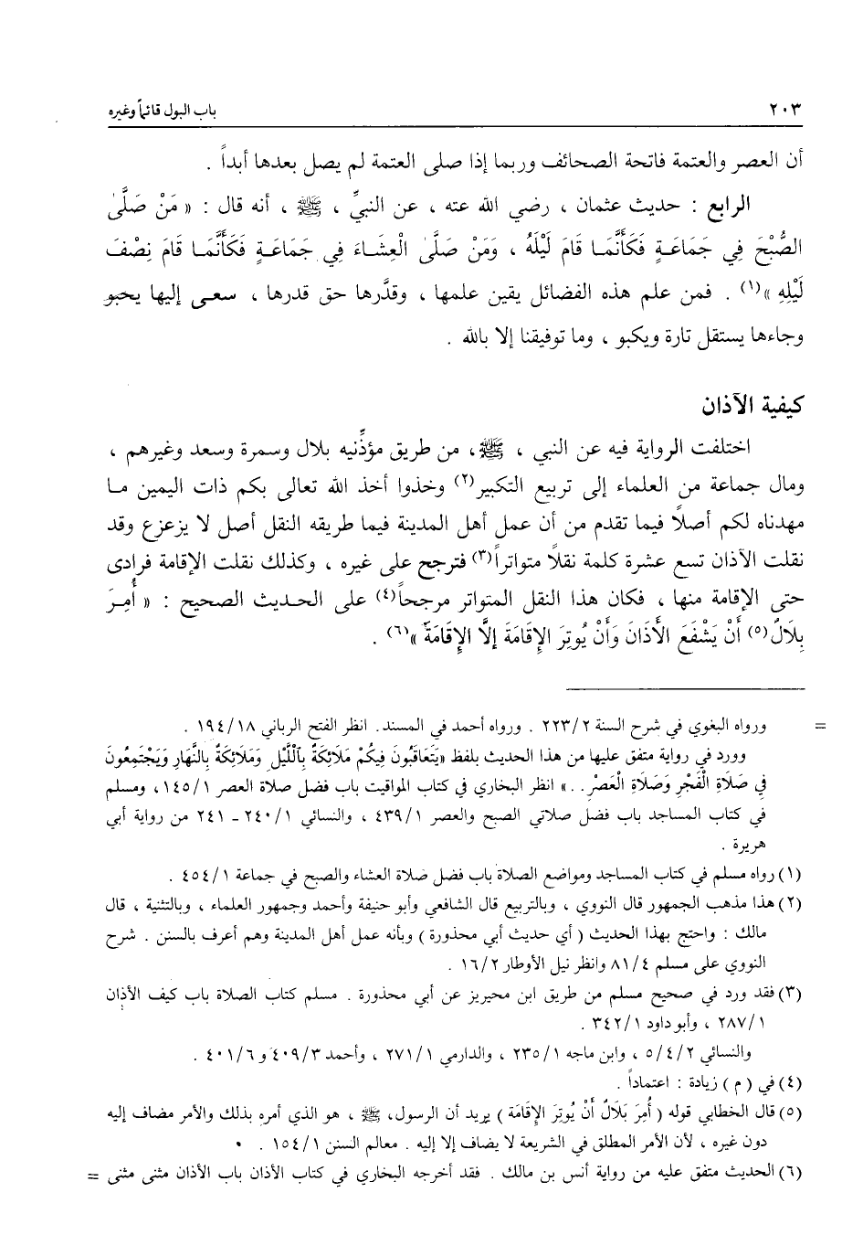 (¬2) هذا مذهب الجمهور قال النووي، وبالتربيع قال الشافعي وأبو حنيفة وأحمد وجمهور العلماء، وبالتثنية، قال مالك: واحتج بهذا الحديث (أي حديث أبي محذورة) وبأنه عمل أهل المدينة وهم أعرف بالسنن. شرح النووي على مسلم 4/ 81 وانظر نيل الأوطار 2/ 16.