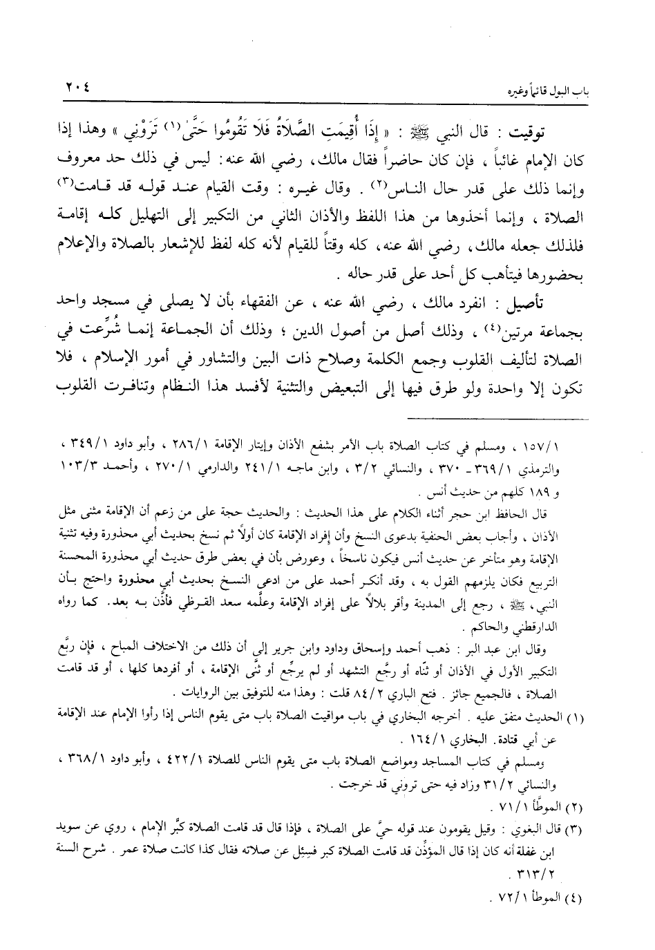 توقيت: قال النبي - صلى الله عليه وسلم -: "إِذَا أُقِيمَتِ الصَّلَاهُّ فَلَا تَقُومُوا حَتى (¬1) تَرَوْني" وهذا إذا كان الإِمام غائباً، فإن كان حاضراً فقال مالك، رضي الله عنه: ليس في ذلك حد معروف وإنما ذلك على قدر حال الناس (¬2). وقال غيره: وقت القيام عند قوله قد قامت (¬3) الصلاة، وإنما أخذوها من هذا اللفظ والأذان الثاني من التكبير إلى التهليل كله إقامة فلذلك جعله مالك، رضي الله عنه، كله وقتاً للقيام لّأنه كله لفظ للإشعار بالصلاة والإعلام بحضورها فيتأهب كل أحد على قدر حاله.