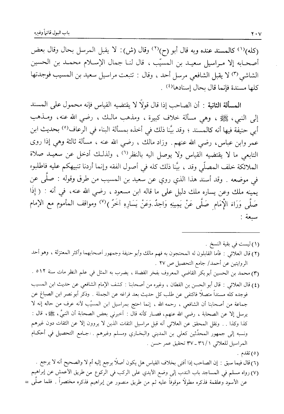 (¬4) قال العلائي: قال أبو الحسن بن القطان، وغيره من أصحابنا: كشف الإِمام الشافعي عن حديث ابن المسيب فوجده كله مسنداً متصلاً فاكتفى عن طلب كل حديث بعد فراغه عن الجملة. وذكر أبو نصر ابن الصباغ عن جماعة من أصحابنا أن الشافعي، رحمه الله، إنما احتج بمراسيل ابن المسيّب لأنه عرف من حاله إنه لا يرسل إلا عن الصحابة، رضي الله عنهم، فصار كأنه قال: أخبرني بعض الصحابة أن النبيَّ، - صلى الله عليه وسلم -, قال: كذا وكذا .. ونقل المحقق عن العلائي أنه قبل مراسيل الثقات الذين لا يروون إلا عن الثقات دون غيرهم ونسبه إلى جمهور المحدِّثين كعلي بن المديني والبخاري ومسلم وغيرهم. جامع التحصيل في أحكام المراسيل للعلائي 1/ 36 - 37 تحقيق عمر حسن.