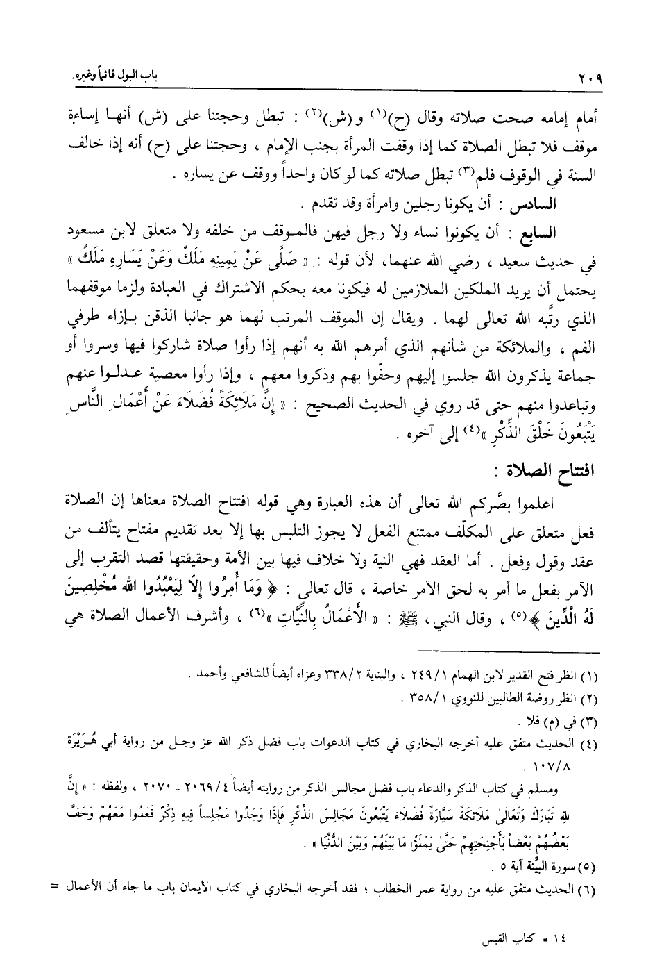 اعلموا بصَّركم الله تعالى أن هذه العبارة وهي قوله افتتاح الصلاة معناها إن الصلاة فعل متعلق على المكلّف ممتنع الفعل لا يجوز التلبس بها إلا بعد تقديم مفتاح يتألف من عقد وقول وفعل. أما العقد فهي النية ولا خلاف فيها بين الأمة وحقيقتها قصد التقرب إلى الآمر بفعل ما أمر به لحق الآمر خاصة، قال تعالى: {وَمَا أُمِرُوا إِلأ لِيَعْبُدُوا الله مُخْلِصِينَ لَهُ الْدِّينَ} (¬5)، وقال النبي - صلى الله عليه وسلم -: "الأعْمَالُ بِالنَيَّاتِ" (¬6)، وأشرف الأعمال الصلاة هي
