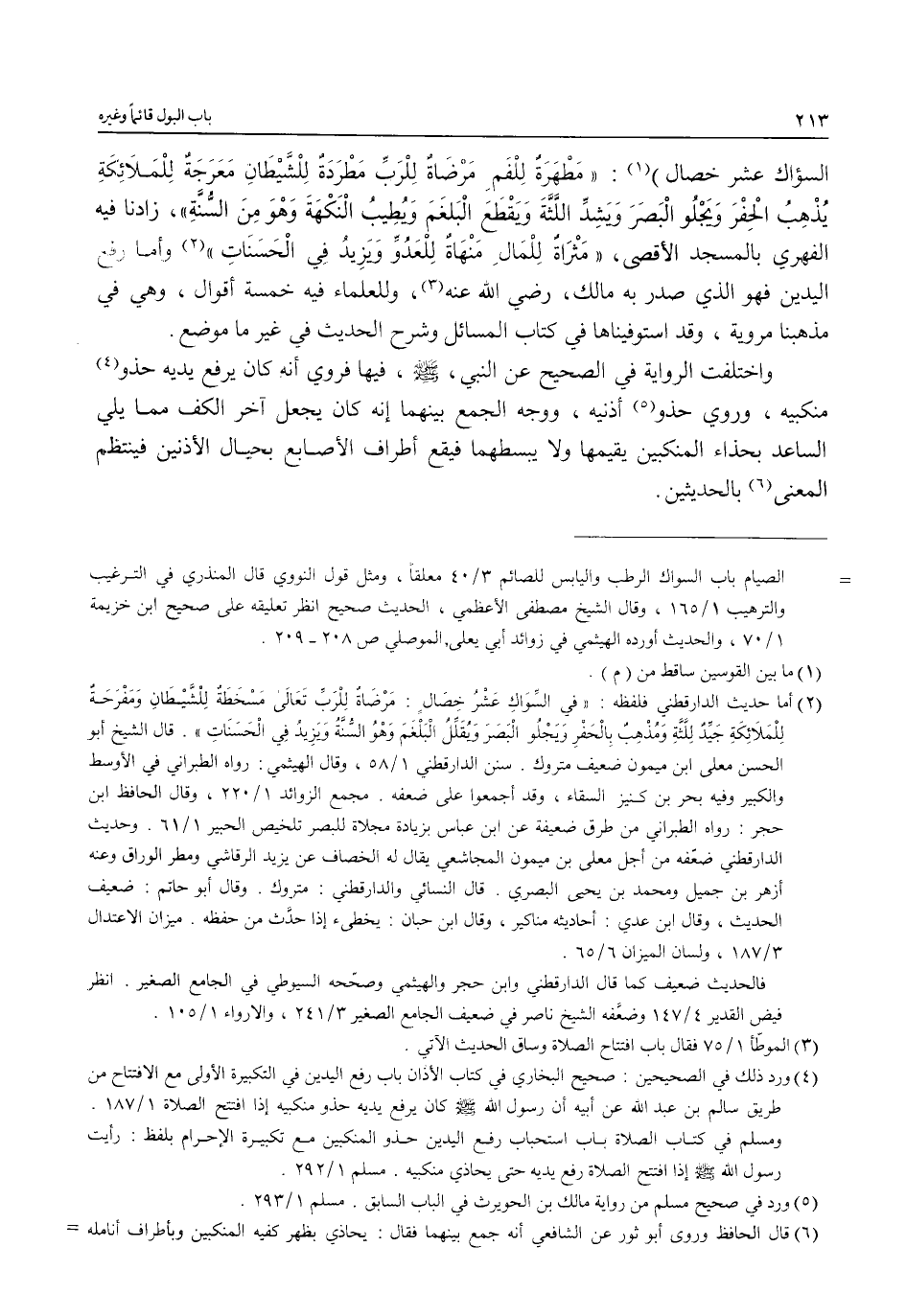 (¬2) أما حديث الدارقطني فلفظه. "في السِّوَاكِ عَشرُ خِصَال: مَرْضَاةٌ لِلْرَبِّ تَعَالَى مَسْخَطَةٌ لِلْشَّيْطَانِ وَمَفْرَحَةٌ لِلْمَلاَئِكَةِ جَيدٌ لِلثَّةِ وَمُذْهِب بِالْحَفْرِ ويَجْلُو الْبَصَرَ ويُقَلِّلُ الْبَلغمَ وَهْوُ السُّنَّةُ ويزِيدُ في الْحَسَنَاتِ". قال الشيخ أبو الحسن معلى ابن ميمون ضعيف متروك. سنن الدارقطني 1/ 58، وقال الهيثمي: رواه الطبراني في الأوسط والكبير وفيه بحر بن كنيز السقاء، وقد أجمعوا على ضعفه. مجمع الزوائد 1/ 220، وقال الحافظ ابن حجر: رواه الطبراني من طرق ضعيفة عن ابن عباس بزيادة مجلاة للبصر تلخيص الحبير 1/ 61. وحديث الدارقطني ضعّفه من أجل معلي بن ميمون المجاشعي يقال له الخصاف عن يزيد الرقاشي ومطر الوراق وعنه أزهر بن جميل ومحمد بن يحيى البصري. قال النسائي والدارقطني. متروك. وقال أبو حاتم: ضعيف الحديث، وقال ابن عدي: أحاديثه مناكير، وقال ابن حبان: يخطئ إذا حدَّث من حفظه. ميزان الاعتدال 3/ 187، ولسان الميزان 6/ 65.