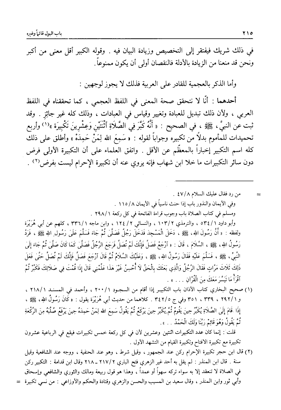 (¬1) صحيح البخاري كتاب الأذان باب التكبير إذا أقام من السجود 1/ 200، وأحمد في المسند 1/ 218، و 1/ 292، 339، 351 وفي ج 5/ 342. كلاهما من حديث أبي هُرَيْرَة يقول: "كَانَ رَسُولُ الله، - صلى الله عليه وسلم -، إِذَا قَامَ إِلَى الصَّلاَةِ يُكَبرُ حِينَ يَقُول ثُم يُكَبِّرُ حِينَ يَرْكَعُ ثُمَّ يَقُولُ وهو قائم لِمَنْ حَمِدَهُ حِينَ يَرْفَعُ صلْبَهُ مِنَ الرِّكْعَةِ ثُمَّ يَقُولُ وَهُوَ قَائِمْ رَبَّنا وَلَكَ الْحَمْدُ .. ".
