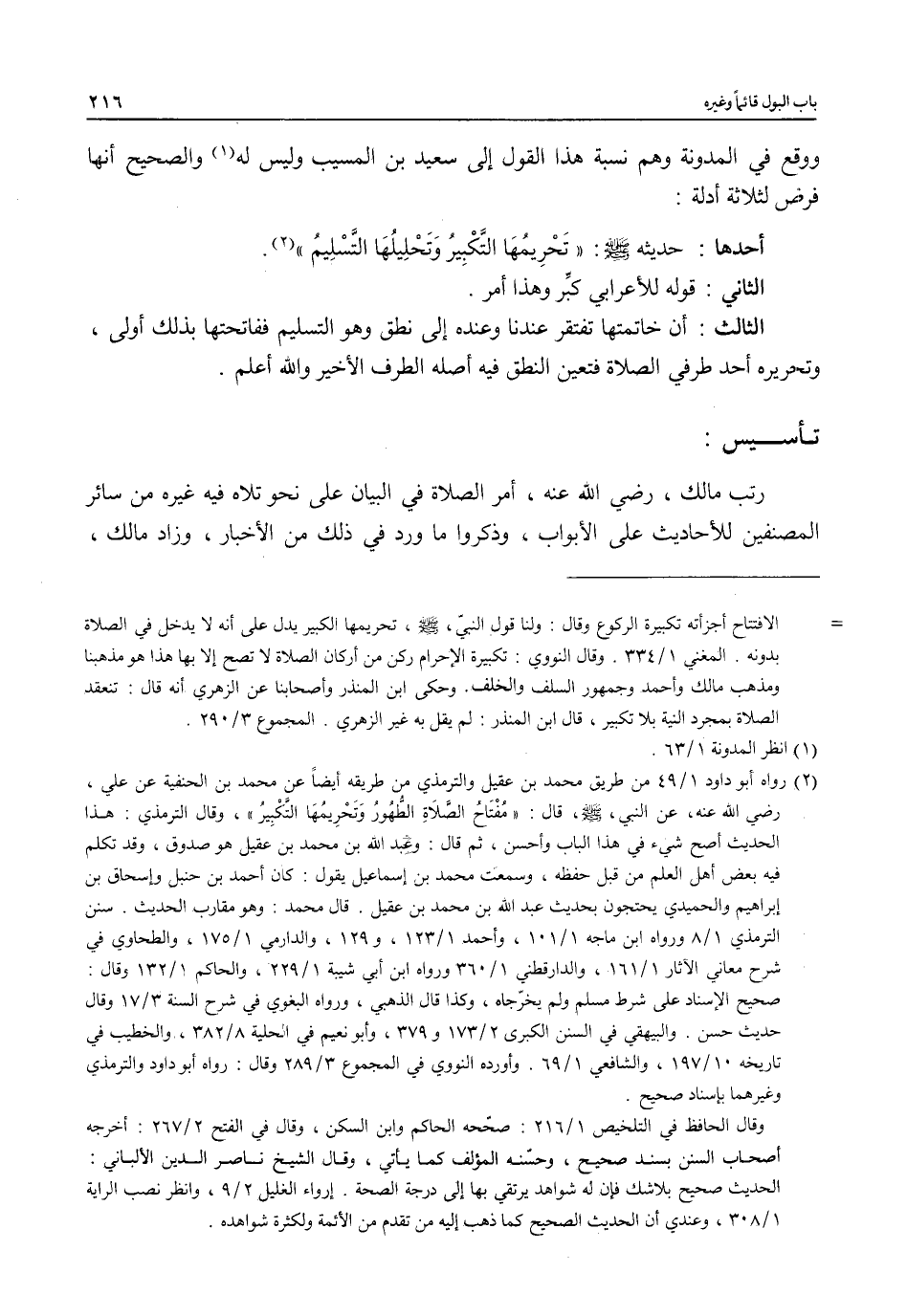 (¬2) رواه أبو داود 1/ 49 من طريق محمَّد بن عقيل والترمذي من طريقه أيضاً عن محمَّد بن الحنفية عن علي، رضي الله عنه، عن النبي،- صلى الله عليه وسلم -، قال: "مُفْتَاحُ الصلاةِ الطُّهُورُ وَتَحْرِيمُهَا التكْبِيرُ"، وقال الترمذي: هذا الحديث أصح شيء في هذا الباب وأحسن، ثم قال: وعبد الله بن محمَّد بن عقيل هو صدوق، وقد تكلم فيه بعض أهل العلم من قبل حفظه، وسمعت محمَّد بن إسماعيل يقول: كان أحمد بن حنبل وإسحاق بن إبراهيم والحميدي يحتجون بحديث عبد الله بن محمَّد بن عقيل. قال محمَّد: وهو مقارب الحديث. سنن الترمذي 1/ 8 ورواه ابن ماجه 1/ 101، وأحمد 1/ 123، و 129، والدارمي 1/ 175، والطحاوي في شرح معاني الآثار 1/ 161، والدارقطني 1/ 360 ورواه ابن أبي شيبة 1/ 229، والحاكم 1/ 132 وقال: صحيح الإسناد على شرط مسلم ولم يخرّجاه، وكذا قال الذهبي، ورواه البغوي في شرح السنة 3/ 17 وقال حديث حسن. والبيهقي في السنن الكبرى 2/ 173 و 379، وأبو نعيم في الحلية 8/ 382، والخطيب في تاريخه 10/ 197، والشافعي 1/ 69. وأورده النووي في المجموع 3/ 289 وقال: رواه أبو داود والترمذي وغيرهما بإسناد صحيح.