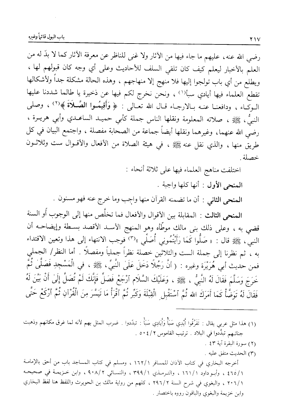 المنحى الثالث: المقابلة بين الأقوال والأفعال فما تخلَّص منها إلى الوجوب أو السنة قضي به، وعلى ذلك بني مالك موطّأه وهو المنهج الأسد الأقصد بسطة وإيضاحه أن النبي، - صلى الله عليه وسلم - قال: "صَلُّوا كَمَا رَأَيْتُمُونِي أُصَلِّي" (¬3) فوجب الانتهاء إلى هذا وتعين الاقتداء به، ثم نظرنا إلى جملة الست والثلاثين خصلة نظراً جملياً ومفصلاً. أما النظر الجملي فمن حديث أبي هُرَيْرَة وغيره: (أنَّ رَجُلًا دَخَلَ على النبي، - صلى الله عليه وسلم -، في الْمَسْجِدِ فَصَلَّي ثُمَّ خَرَجَ وَسَلَّمَ فَقَالَ لَهُ النَّبِيُّ، - صلى الله عليه وسلم -، وَعَلَيْكَ السَّلَام ارْجَعْ فَصَلِّ فَإِنَّكَ لَمْ تُصَلَّ إِلى أَنْ بَيَّنَ لَهُ فَقَالَ لَهُ تَوَضَّأْ كَمَا أَمَرَكَ الله ثُمَّ اسْتَقْبِلِ الْقِبْلَةَ وَكَبِّر ثُمَّ اقْرَأْ مَا تَيَسَّرَ مِنَ الْقُرْآنِ ثُمَّ ارْكَعْ حَتَّى