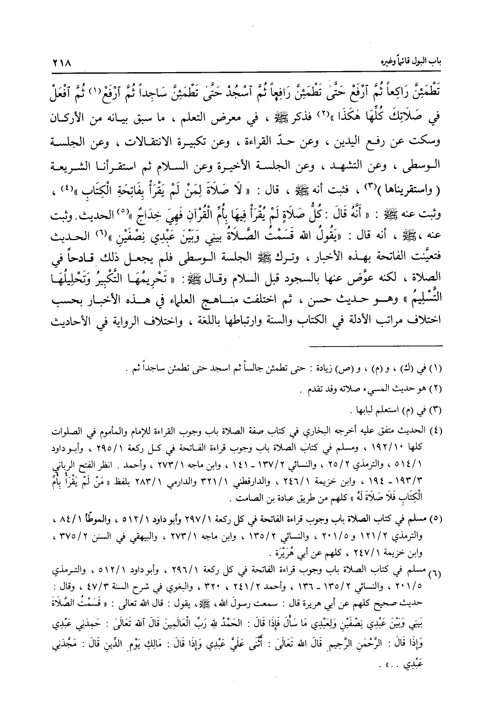 تَطْمَئِنَّ رَاكِعاً ثمَّ ارْفَعْ حَتَّى تَطْمَئِنَّ رَافِعاً ثمَّ اسْجدْ حَتَّى تَطْمَئِنَّ سَاجِداً ثم ارْفَعْ (¬1) ثم افْعَلْ في صَلَاتِكَ كلِّهَا هكَذَا" (¬2) فذكر - صلى الله عليه وسلم -، في معرض التعلم، ما سبق بيانه من الأركان وسكت عن رفع اليدين، وعن حدّ القراءة، وعن تكبيرة الانتقالات، وعن الجلسة الوسطى، وعن التشهد، وعن الجلسة الأخيرة وعن السلام ثم استقرأنا الشريعة (واستقريناها) (¬3)، فثبت أنه - صلى الله عليه وسلم -، قال: "لَا صَلاَةَ لِمَنْ لَمْ يَقْرَأْ بِفَاتِحَةِ الْكِتَابِ" (¬4)، وثبت عنه - صلى الله عليه وسلم -: "أَنَه قَالَ: كلُّ صَلَاةٍ لَم يُقْرَأْ فِيهَا بِأمِّ الْقرْآنِ فَهِيَ خِدَاجٌ" (¬5) الحديث. وثبت عنه، - صلى الله عليه وسلم -، أنه قال: "يَقُولُ الله قَسَمْت الصلَاةُ بيني وَبَيْنَ عَبدِي نِصْفَيْنِ" (¬6) الحديث فتعيَّنت الفاتحة بهذه الأخبار، وترك - صلى الله عليه وسلم - الجلسة الوسطى فلم يجعل ذلك قادحاً في الصلاة، لكنه عوَّض عنها بالسجود قبل السلام وقال - صلى الله عليه وسلم -: "تَحْريمهَا التَكْبِير وَتَحْلِيلهَا التَّسْلِيم" وهو حديث حسن، ثم اختلفت مناهج العلماء في هذه الأخبار بحسب اختلاف مراتب الأدلة في الكتاب والسنة وارتباطها باللغة، واختلاف الرواية في الأحاديث