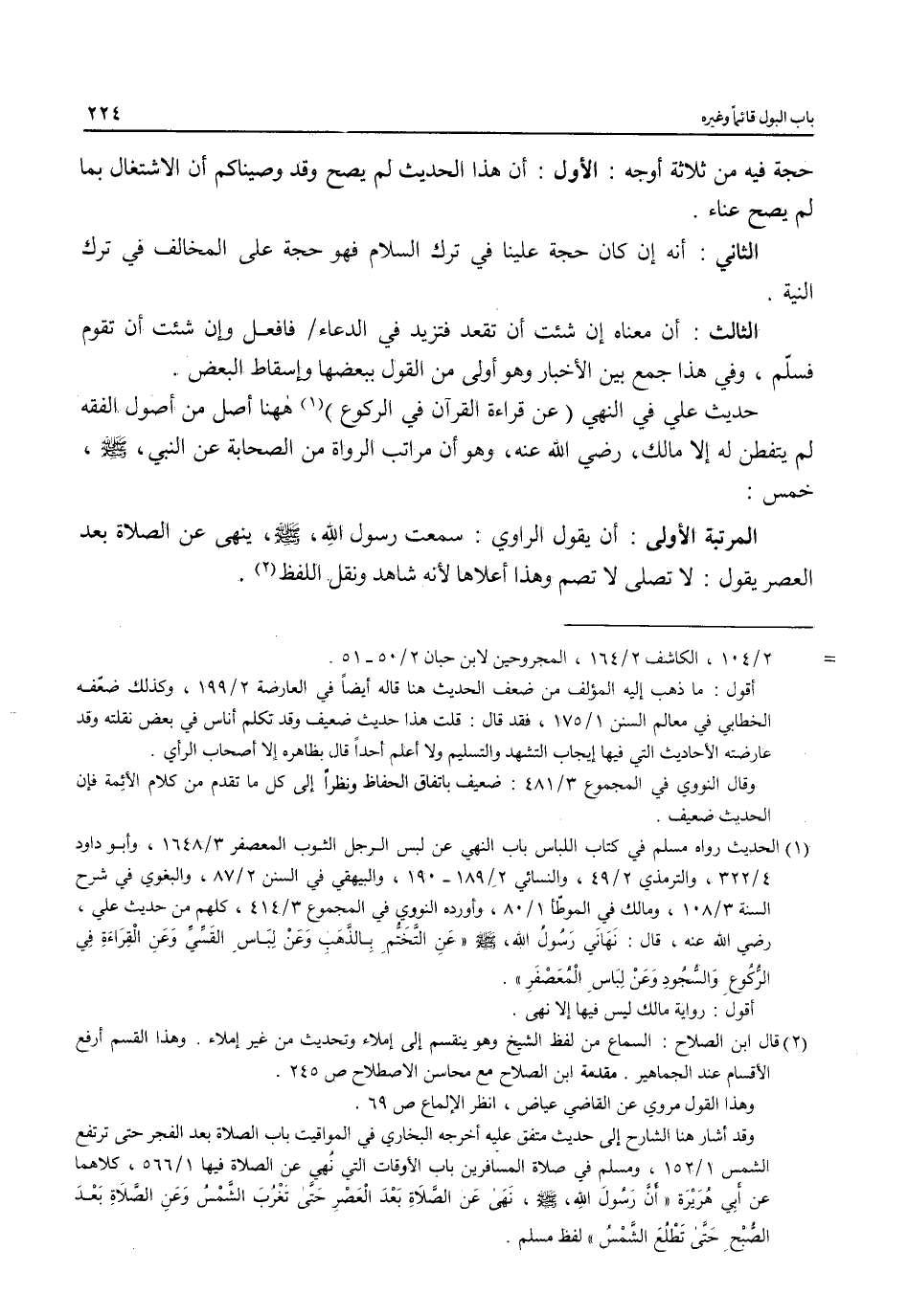 (¬1) الحديث رواه مسلم في كتاب اللباس باب النهي عن لبس الرجل الثوب المعصفر 3/ 1648، وأبو داود 4/ 322، والترمذي 2/ 49، والنسائي 2/ 189 - 190، والبيهقي في السنن 2/ 87، والبغوي في شرح السنة 3/ 108، ومالك فيِ الموطّأ 1/ 80، وأورده النووي في المجموع 3/ 414، كلهم من حديث علي، رضي الله عنه، قال: نَهَاني رَسُولُ الله، - صلى الله عليه وسلم - "عَنِ التَّخَتُّمِ بِالذَّهَب وَعنْ لبَاسِ القَسِّيِّ وَعَنِ الْقِرَاءة في الرُّكُوعِ وَالسجُودِ وَعَنْ لِباسِ الْمعَصْفَرِ".