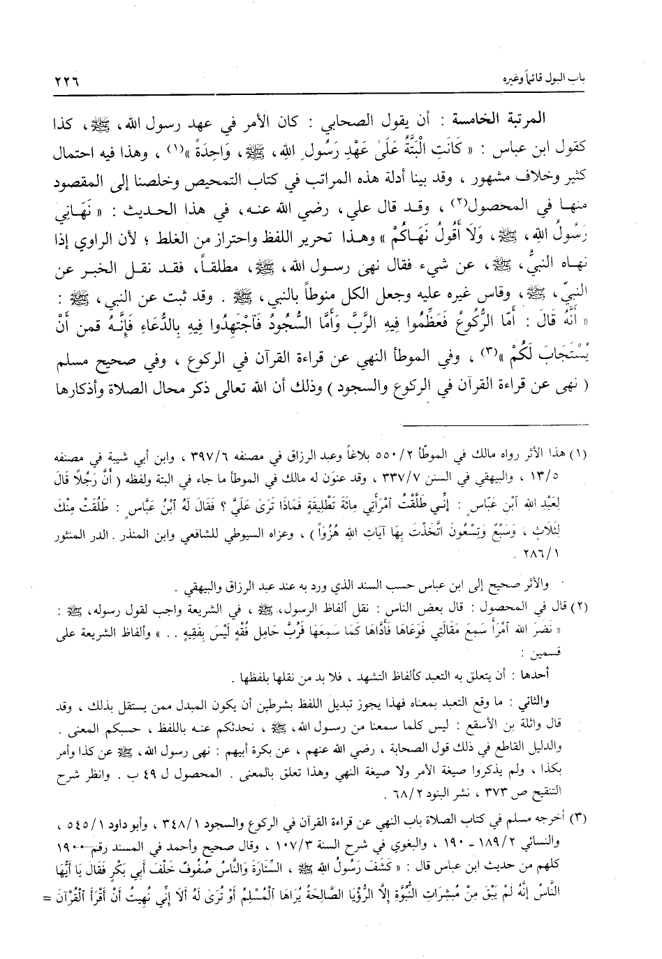 المرتبة الخامسة: أن يقول الصحابي: كان الأمر في عهد رسول الله، - صلى الله عليه وسلم -، كذا كقول ابن عباس: "كَانَتِ الْبَتَّةُ عَلَى عَهْدِ رَسُولِ الله، - صلى الله عليه وسلم -، وَاحِدةً" (¬1)، وهذا فيه احتمال كثير وخلاف مشهور، وقد بينا أدلة هذه المراتب في كتاب التمحيص وخلصنا إلى المقصود منها في المحصول (¬2)، وقد قال علي، رضي الله عنه، في هذا الحديث: "نَهَانِي رسولُ الله، - صلى الله عليه وسلم -، وَلاَ أَقُولُ نَهَاكُمْ" وهذا تحرير اللفظ واحتراز من الغلط؛ لأن الراوي إذا نهاه النبيُّ، - صلى الله عليه وسلم -، عن شيء فقال نهى رسول الله، - صلى الله عليه وسلم -، مطلقاً، فقد نقل الخبر عن النبيّ، - صلى الله عليه وسلم -، وقاس غيره عليه وجعل الكل منوطاً بالنبي، - صلى الله عليه وسلم -. وقد ثبت عن النبي، - صلى الله عليه وسلم -: "اَنَّة قَالَ: أَمّا الرُّكُوعُ فَعَظِّمُوا فِيهِ الرَّبَّ وَأَمَّا السُّجُودُ فَاجْتَهِدُوا فِيهِ بِالدُّعَاءِ فَإِنَّهُ قمن أَنْ يُستَجَابَ لَكُمْ" (¬3)، وفي الموطأ النهي عن قراءة القرآن في الركوع، وفي صحيح مسلم (نهى عن قراءة القرآن في الركوع والسجود) وذلك أن الله تعالى ذكر محال الصلاة وأذكارها