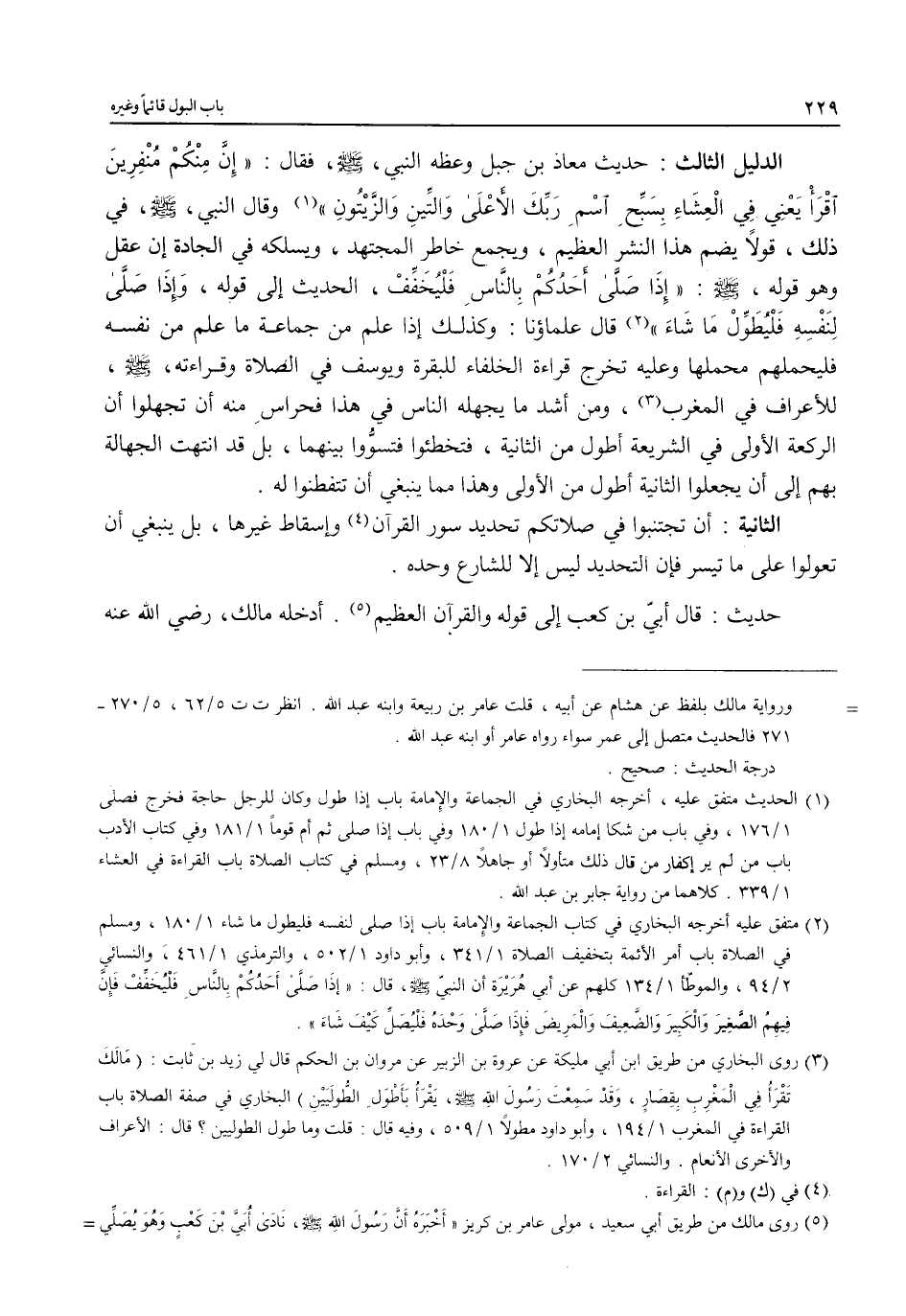 الدليل الثالث: حديث معاذ بن جبل وعظه النبي، - صلى الله عليه وسلم -، فقال: "إِن مِنْكُمْ مُنْفِرِينَ اقْرَأْ يَعْنِي في الْعِشَاءِ بِسَبِّحِ اسْمِ رَبِّكَ الأعْلَى وَالتِّينِ وَالزَّيْتُونِ" (¬1) وقال النبي، - صلى الله عليه وسلم -، في ذلك، قولاً يضم هذا النشر العظيم، ويجمع خاطر المجتهد، ويسلكه في العبادة إن عقل وهو قوله - صلى الله عليه وسلم -: "إِذَا صَلَّى أَحَدُكُمْ بِالنَّاسِ فَلْيُخَفِّفْ، الحديث إلى قوله، وَإِذَا صَلَّى لِنَفْسِهِ فَلْيطَوِّلْ مَا شَاء" (¬2) قال علماؤنا: وكذلك إذا علم من جماعة ما علم من نفسه فليحملهم محملها وعليه تخرج قراءة الخلفاء للبقرة ويوسف في الصلاة وقراءته،- صلى الله عليه وسلم -، للأعراف في المغرب (¬3)، ومن أشد ما يجهله الناس في هذا فحراسِ منه أن تجهلوا أن الركعة الأولى في الشريعة أطول من الثانية، فتخطئوا فتسوُّوا بينهما، بل قد انتهت الجهالة بهم إلى أن يجعلوا الثانية أطول من الأولى وهذا مما ينبغي أن تتفطنوا له.