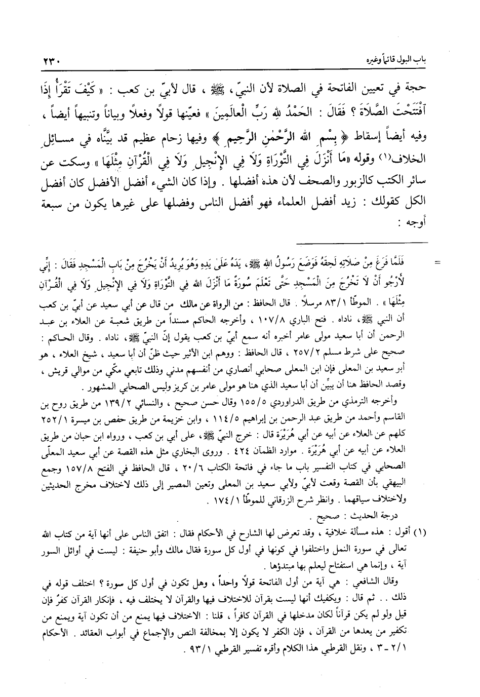 = فَلَمَّا فَرَغَ مِنْ صلاَتِهِ لَحِقَهُ فَوَضَعَ رَسُولُ الله - صلى الله عليه وسلم -، يَدهُ على يدِهِ وهو يُريُد أنْ يخرُج من باب المسجد فقال: إنِّي لأرْجُو أَنْ لاَ تَخْرُجَ مِنَ الْمَسْجِدِ حَتَّى تَعْلَمَ سُورَةً مَا أَنْزَلَ الله في التَّوْرَاةِ وَلَا في الإِنْجِيلِ وَلَا في الْقُرْآنِ مِثْلَهَا". الموطّأ 1/ 83 مرسلاً. قال الحافظ: من الرواة عن مالك من قال عن أبي سعيد عن أبيّ بن كعب أن النبي - صلى الله عليه وسلم -، ناداه. فتح الباري 8/ 107، وأخرجه الحاكم مسنداً من طريق شعبة عن العلاء بن عبد الرحمن أن أبا سعيد مولى عامر أخبره أنه سمع أبيّ بن كعب يقول إن النبي - صلى الله عليه وسلم -، ناداه. وقال الحاكم: صحيح على شرط مسلم 2/ 257، قال الحافظ: ووهم ابن الأثير حيث ظنّ أن أبا سعيد، شيخ العلاء، هو أبو سعيد بن المعلى فإن ابن المعلى صحابي أنصاري من أنفسهم مدني وذلك تابعي مكّي من موالي قريش، وقصد الحافظ هنا أن يبيِّن أن أبا سعيد الذي هنا هو مولى عامر بن كريز وليس الصحابي المشهور.