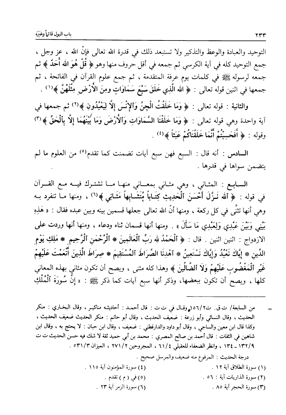 التوحيد والعبادة والوعظ والتذكير ولا تستبعد ذلك في قدرة الله تعالى فإنّ الله، عز وجل، جمع التوحيد كله في آية الكرسي ثم جمعه في أقل حروف منها وهو {قُلْ هُوَ اللَّهُ أَحَدٌ} ثم جمعه لرسوله - صلى الله عليه وسلم - في كلمات يوم عرفة المتقدمة، ثم جمع علوم القرآن في الفاتحة، ثم جمعها في اثنين قوله تعالى: {اللَّهُ الَّذِي خَلَقَ سَبْعَ سَمَاوَاتٍ وَمِنَ الْأَرْضِ مِثْلَهُنَّ} (¬1).