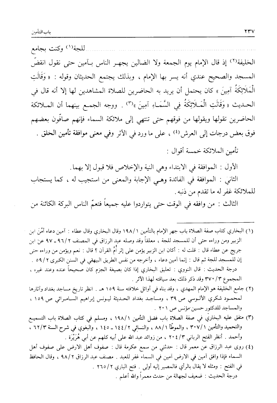 (¬4) روى عبد الرزاق عن معمر قال: حدثني من سمع عكرمة قال: صفوف أهل الأرض على صفوف أهل السماء فإذا وافق آمين في الأرض آمين في السماء غفر للعبد. مصنف عبد الرزاق 2/ 98، وقال الحافظ في الفتح: ومثله لا يقال بالرأي فالمصير إليه أولى. فتح الباري 2/ 265.