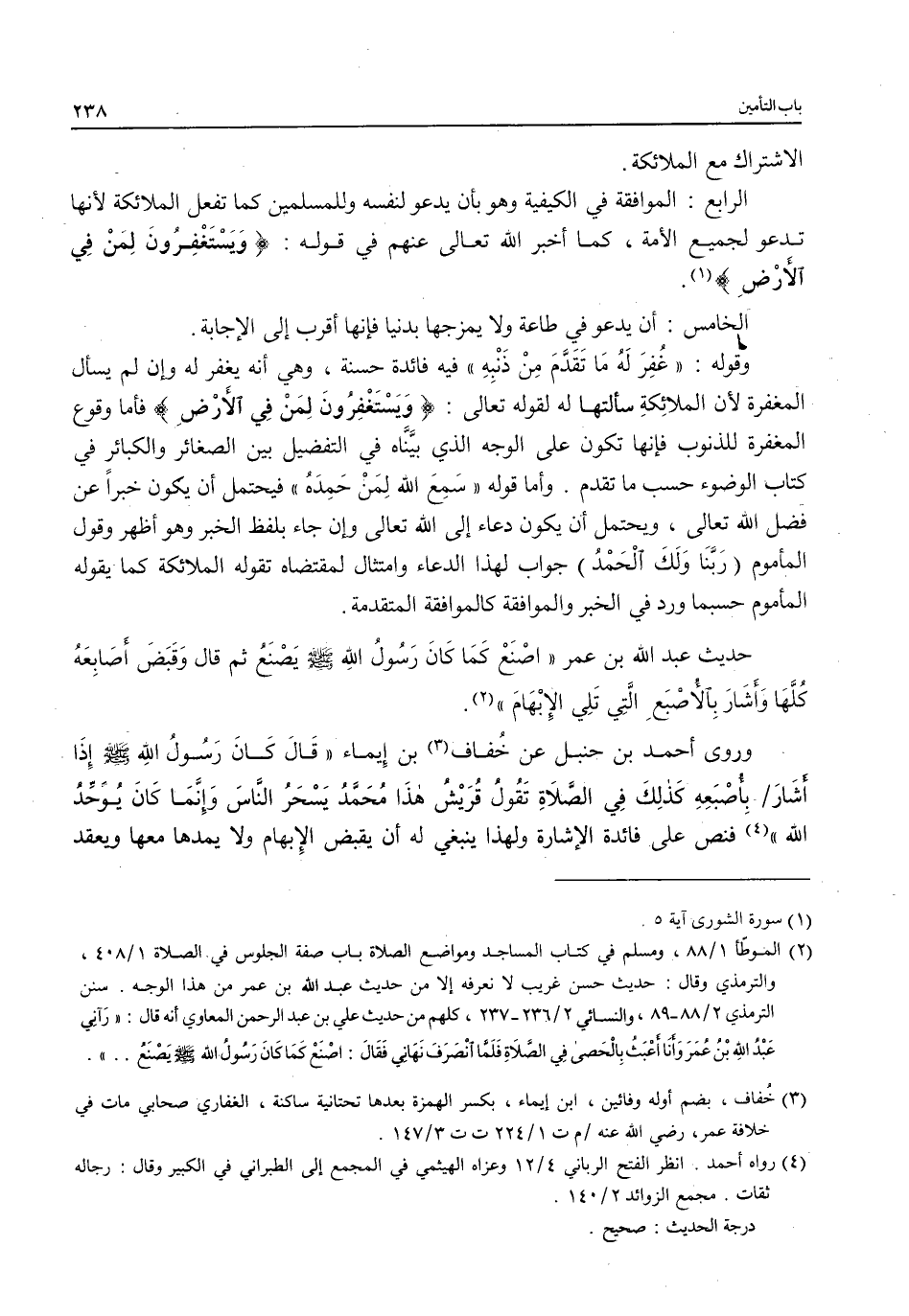 الرابع: الموافقة في الكيفية وهو بأن يدعو لنفسه وللمسلمين كما تفعل الملائكة لأنها تدعو لجميع الأمة، كما أخبر الله تعالى عنهم في قوله: {وَيَسْتَغْفِرُونَ لِمَنْ في الأَرْضَ} (¬1).