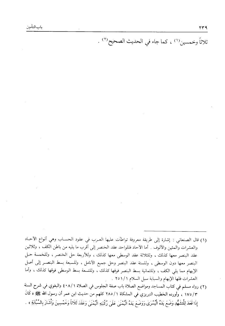 (¬1) قال الصنعاني: إشارة إلى طريقة معروفة تواطأت عليها العرب في عقود الحساب وهي أنواع الآحاد والعشرات والمئين والألوف. أما الآحاد فللواحد عقد الخنصر إلى أقرب ما يليه من باطن الكف، وثلاثين عقد البنصر معها كذلك، وللثلاثة عقد الوسطى معها كذلك، وللأربعة حل الخنصر، وللخمسة حل البنصر معها دون الوسطى، وللستة عقد البنصر وحل جميع الأنامل، وللسبعة بسط البنصر إلى أصل الإبهام مما يلي الكف، وللثمانية بسط البنصر فوقها كذلك، وللتسعة بسط الوسطى فوقها كذلك، وأما العشرات فلها الإبهام والسبابة سبل السلام 1/ 251.