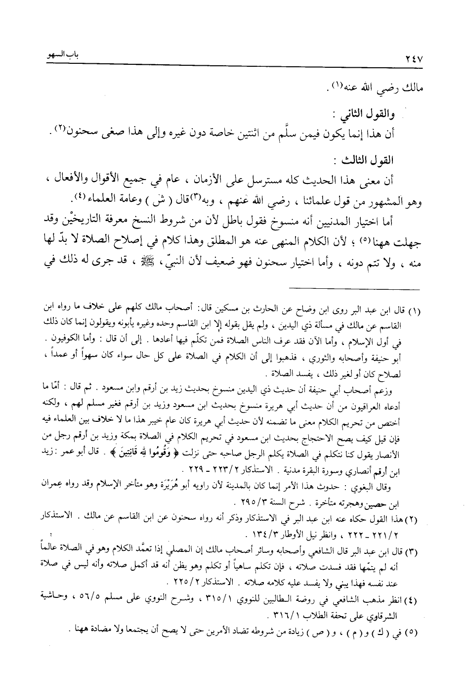 (¬1) قال ابن عبد البر روى ابن وضاح عن الحارث بن مسكين قال: أصحاب مالك كلهم على خلاف ما رواه ابن القاسم عن مالك في مسألة في اليدين، ولم يقل بقوله إلا ابن القاسم وحده وغيره يأبونه ويقولون إنما كان ذلك في أول الإِسلام، وأما الآن فقد عرف الناس الصلاة فمن تكلّم فيها أعادها. إلى أن قال: وأما الكوفيون. أبو حنيفة وأصحابه والثوري، فذهبوا إلى أن الكلام في الصلاة على كل حال سواء كان سهواً أو عمداً، لصلاح كان أو لغير ذلك، يفسد الصلاة.