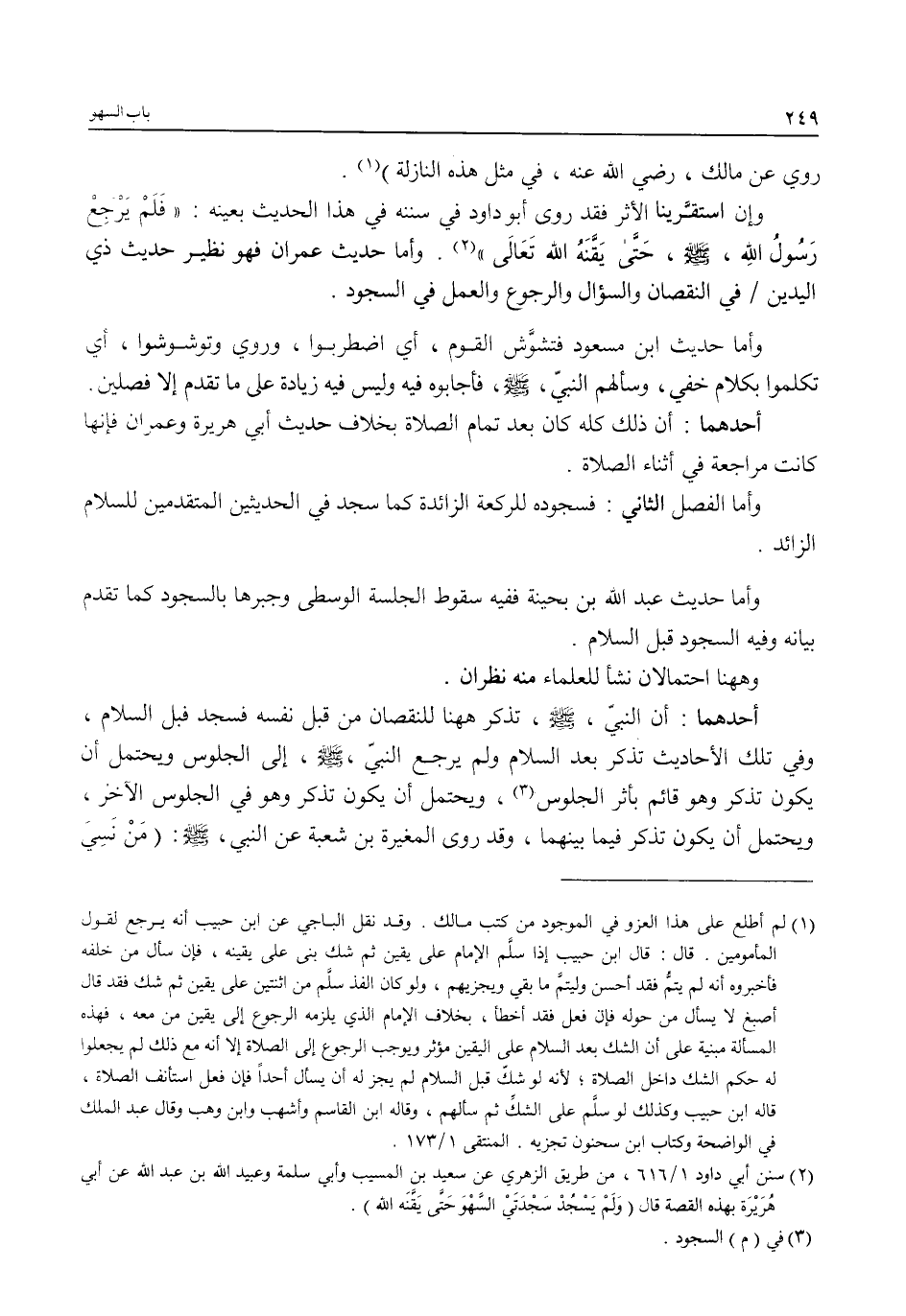 وإن استقرينا الأثر فقد روى أبو داود في سننه في هذا الحديث بعينه: "فَلَمْ يَرجِعْ رَسُولُ الله، - صلى الله عليه وسلم -، حَتَى يَقَّنَهُ الله تَعَالَى" (¬2). وأما حديث عمران فهو نظير حديث ذي اليدين في النقصان والسؤال والرجوع والعمل في السجود.