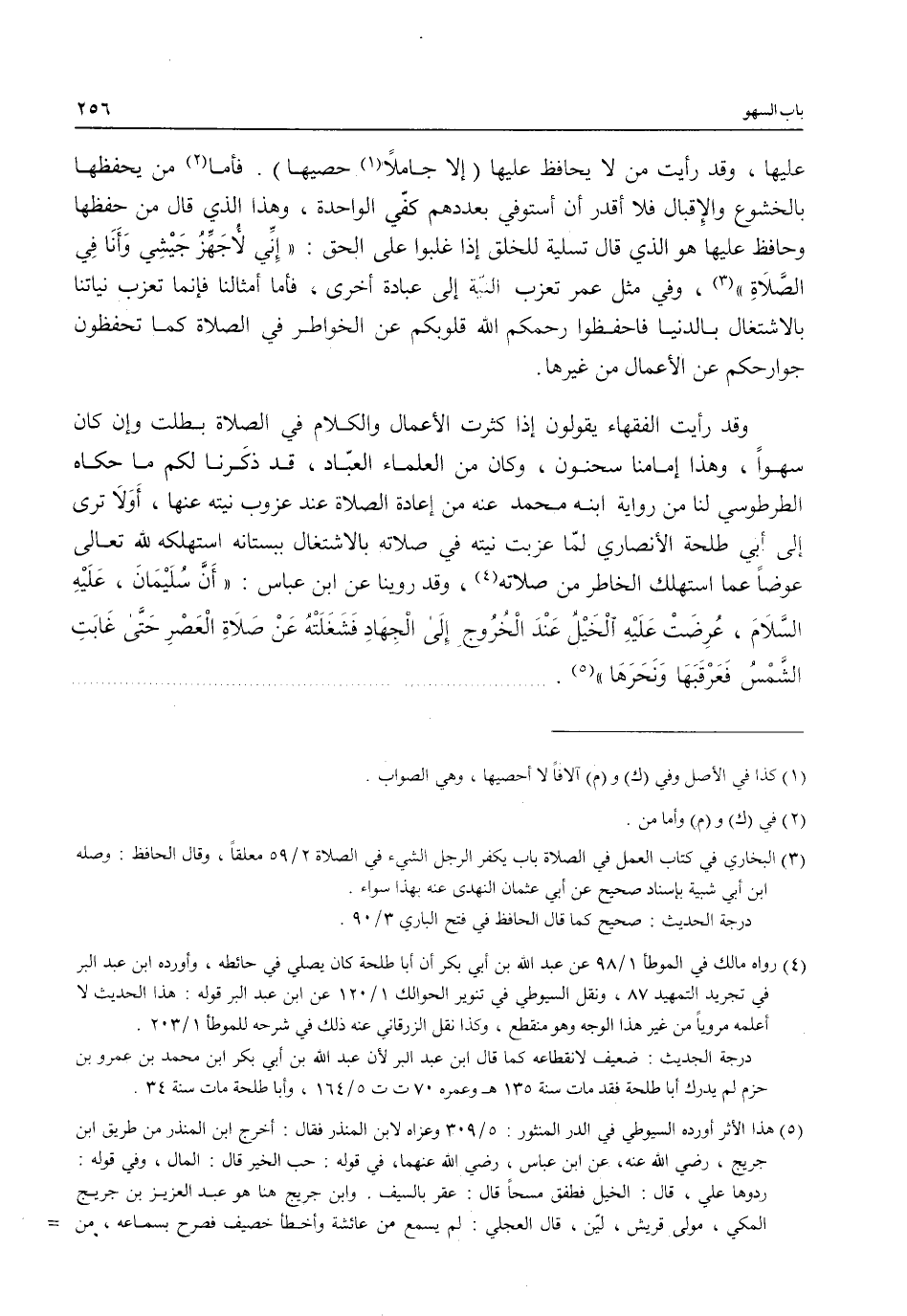 (¬4) رواه مالك في الموطأ 1/ 98 عن عبد الله بن أبي بكر أن أبا طلحة كان يصلي في حائطه، وأورده ابن عبد البر في تجريد التمهيد 87، ونقل السيوطي في تنوير الحوالك 1/ 120 عن ابن عبد البر قوله: هذا الحديث لا أعلمه مروياً من غير هذا الوجه وهو منقطع، وكذا نقل الزرقاني عنه ذلك في شرحه للموطأ 1/ 203.