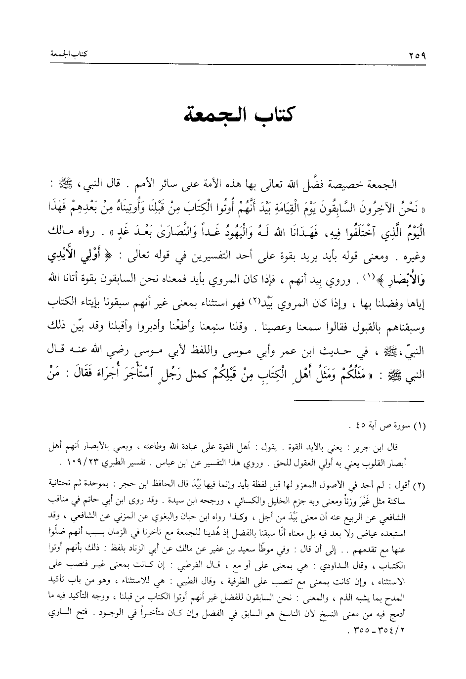 الجمعة خصيصة فضَّل الله تعالى بها هذه الأمة على سائر الأمم. قال النبي، - صلى الله عليه وسلم -: "نَحْنُ الآخِرونَ السَّابِقونَ يَوْمَ الْقِيَامَةِ بَيْدَ أَنَّهمْ أوتوأ الْكِتَابَ مِنْ قَبْلِنَا وَأُوتِينَاهُ مِنْ بَعْدِهِمْ فَهذَا الْيَوْمُ الَّذِي اخْتَلَفُوا فِيهِ، فَهَدَانَا الله لَهُ وَالْيَهُودُ غَدًا وَالنَّصارى بَعْدَ غَدٍ". رواه مالك وغيره. ومعنى قوله بأيد يريد بقوة على أحد التفسيرين في قوله تعالى: {أُولِي الْأَيْدِي وَالْأَبْصَارِ} (¬1). وروي بِيد أنهم، فإذا كان المروي بأيد فمعناه نحن السابقون بقوة أتانا الله إياها وفضلنا بها، وإذا كان المروي بَيْد (¬2) فهو استثناء بمعنى غير أنهم سبقونا بإيتاء الكتاب وسبقناهم بالقبول فقالوا سمعنا وعصينا. وقلنا سمِعنا وأطعْنا وأدبروا وأقبلنا وقد بيّن ذلك النبيّ، - صلى الله عليه وسلم -، في حديث ابن عمر وأبي موسى واللفظ لأبي موسى رضي الله عنه قال النبي - صلى الله عليه وسلم -: "مَثَلُكُمْ وَمَثَلُ أهْلِ الْكِتَابِ مِنْ قَبْلِكُمْ كمثل رَجُلٍ اسْتَأجَرَ أُجَرَاءَ فَقَالَ: مَنْ