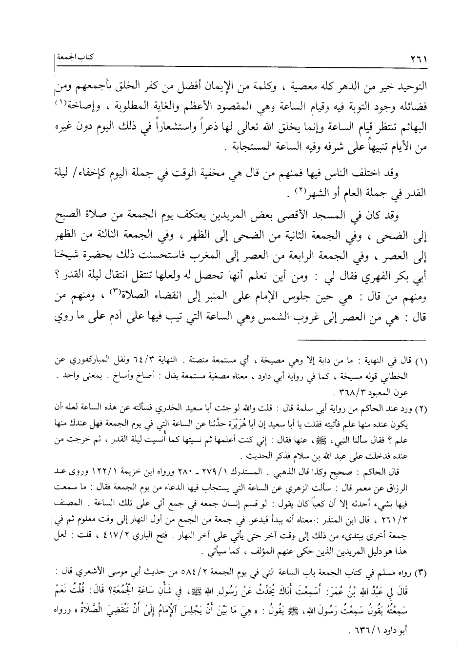 (¬3) رواه مسلم في كتاب الجمعة باب الساعة التي في يوم الجمعة 2/ 584 من حديث أبي موسى الأشعري قال: قَالَ لِي عبْدُ الله بْنُ عُمَرَ: أسَمِعْتَ أبَاكَ يُحَدِّثُ عَنْ رَسُولِ الله - صلى الله عليه وسلم -، في شَأْنِ سَاعَةِ الْجُمُعَةِ؟ قَالَ: قُلْتُ نَعَمْ سَمِعْتُهُ يَقُولُ سَمِعْتُ رَسُولَ الله - صلى الله عليه وسلم - يَقُولُ: "هِيَ مَا بَيْنَ أن يَجْلِس الْإِمَامُ إِلى أن تَنْقضِيَ الْصَّلاَةُ" ورواه أبو داود 1/ 636.