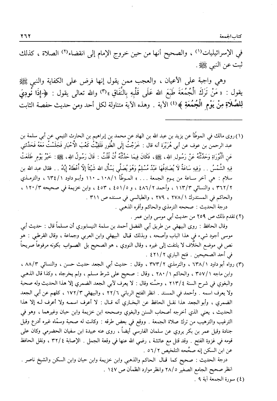 (¬1) روى مالك في الموطّأ عن يزيد بن عبد الله بن الهاد عن محمد بن إبراهيم بن الحارث التيمي عن أبي سلمة بن عبد الرحمن بن عوف عن أبي هُرَيْرَة أنه قال: خَرَجْتُ إِلَى الطُّورِ فَلَقِيتُ كَعْبَ الأحْبَارِ فَجَلَسْت مَعَهُ فَحَدَّثنِي عَنِ التَّورَاةِ وَحَدَّثْتُهُ عَنْ رَسُولِ الله، - صلى الله عليه وسلم -، فَكَانَ فِيمَا حَدَّثْتُهُ أن قُلْتُ: قَالَ رَسُولُ الله، - صلى الله عليه وسلم -: خيرُ يَوْمٍ طَلَعَتْ فِيهِ الشَّمْسُ .. وَفِيهِ سَاعَةُ لاَ يُصَادِفُهَا عبد مُسْلِم وَهُوَ يصلِّي يَسْأل الله شَيْئًا إلَّا أعطَاهْ إِياهُ .. فقال عبد الله بن سلام: هي آخر ساعة من يوم الجمعة ... " الموطأ 1/ 108 - 110 وأبو داود 1/ 634، والترمذي 2/ 362، والنسائي 3/ 113، وأحمد 2/ 486، و 5/ 451، 453، وابن خزيمة في صحيحه 3/ 120، والحاكم في المستدرك 1/ 278، 279، والطيالسي في مسنده ص 311.