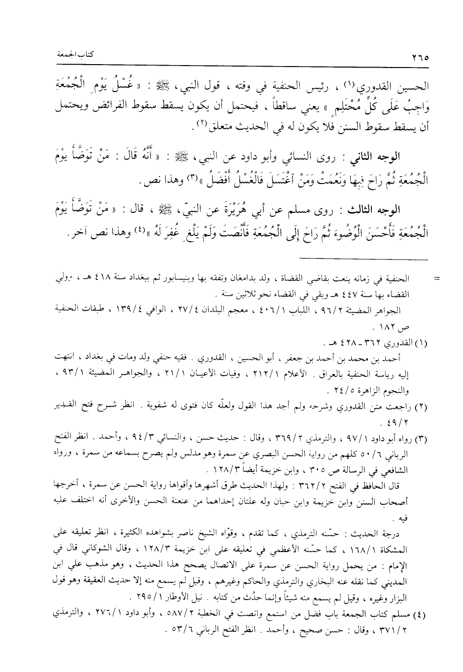 الحسين القدوري (¬1)، رئيس الحنفية في وقته، قول النبي، - صلى الله عليه وسلم -: "غُسْل يَومِ الْجُمُعَةِ وَاجِبُ عَلَى كُلِّ محْتَلِمٍ" يعني ساقطًا، فيحتمل أن يكون يسقط سقوط الفرائض ويحتمل أن يسقط سقوط السنن فلا يكون له في الحديث متعلق (¬2).