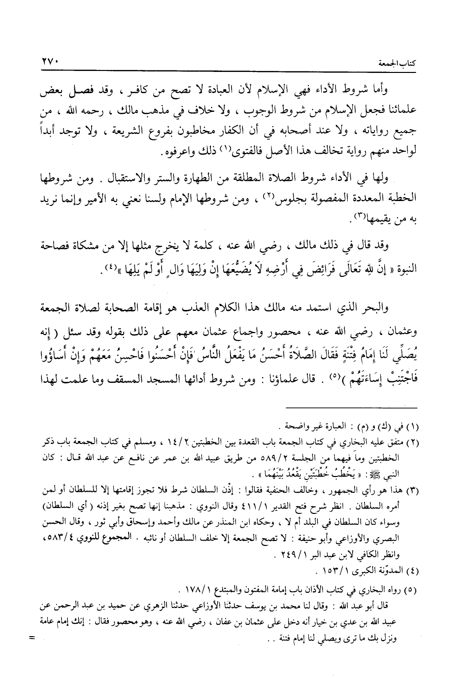 والبحر الذي استمد منه مالك هذا الكلام العذب هو إقامة الصحابة لصلاة الجمعة وعثمان، رضي الله عنه، محصور واجماع عثمان معهم على ذلك بقوله وقد سئل (إِنه يُصَلِّي لَنَا إِمَامُ فِتْنَةٍ فَقَالَ الصَّلاَةُ أَحْسَنُ مَا يَفْعَلُ النَّاسُ فَإِنْ أحْسَنُوا فَاحْسِنُ مَعَهُمْ وَإِنْ أسَاؤُوا فَاجْتَنِبْ إِسَاءَتَهُمْ) (¬5). قال علماؤنا: ومن شروط أدائها المسجد المسقف وما علمت لهذا